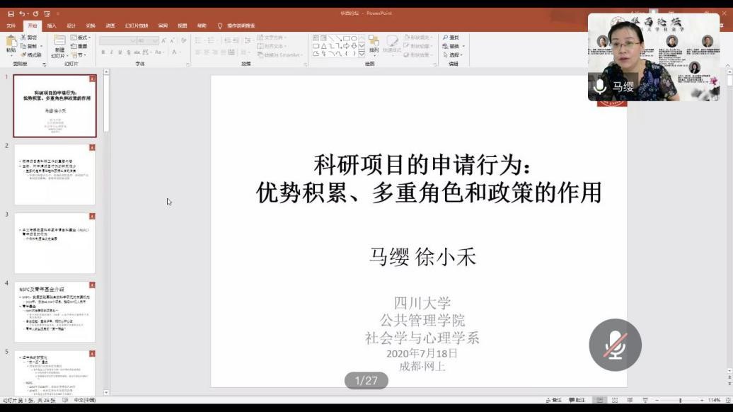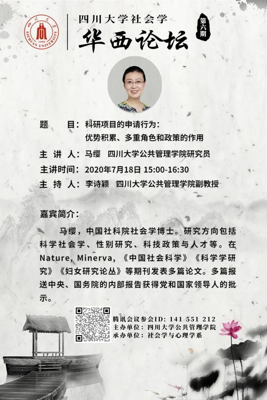 2020年7月18日下午15:00,太阳成集团tyc234cc社会学华西论坛云系列讲座第六期于线上成功举行。太阳成集团tyc234cc社会学与心理学系马缨研究员发表了题为“科研项目的申请行为:优势积累、多重角色和政策的作用”的精彩演讲。讲座由社会学与心理学系李诗颖副教授主持,百余名来自公司和省内外兄弟院校的师生参加了讲座。