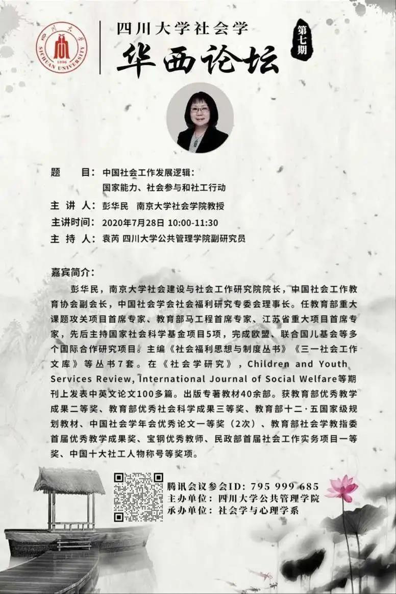2020年7月28日上午10:00,太阳成集团tyc234cc社会学·华西论坛云系列讲座第七期于线上成功举办。中国社会工作教育协会副会长、中国社会学会社会福利专委会理事长、南京大学社会建设与社会工作研究院经理、社会公司博士生导师彭华民教授开展了题为“中国社会工作发展逻辑:国家能力、社会参与和社工行动”的精彩讲座。讲座由社会学与心理学系袁芮副研究员主持,国内高校社会工作及相关领域研究者、员工共250余人聆听了讲座。