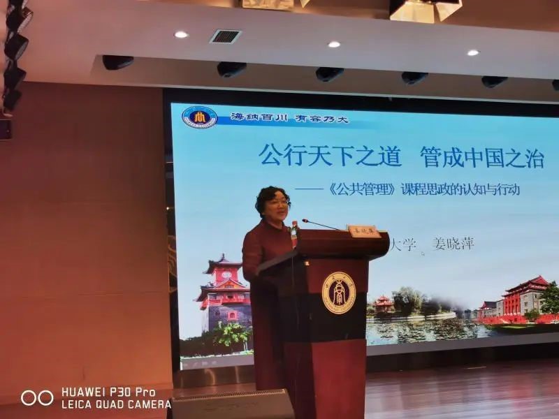 公司姜晓萍教授结合自身教育实践,以《公行天下之道,管成中国之治》为题,从认知本来、领悟原来、面向未来三个角度对思政教育建设做出全面分析。