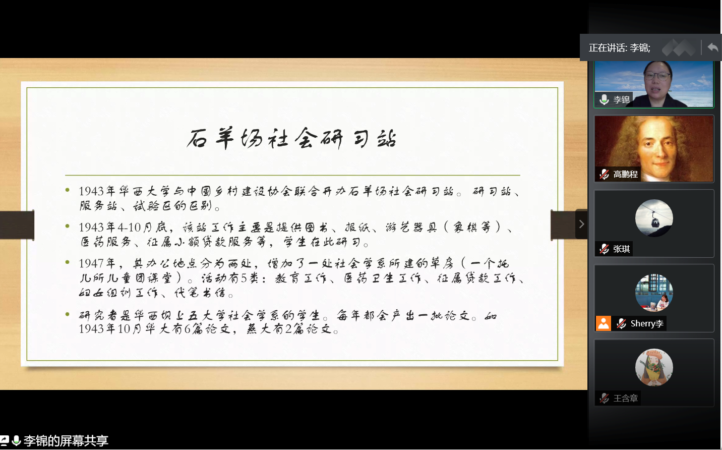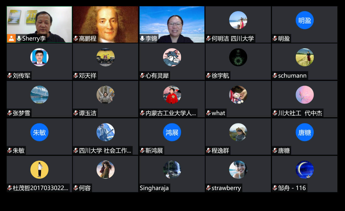 在讲座的问答环节,师生们就“社会学如何更好地传承”“社会学该怎样接地气” 等问题与李锦教授进行了深入的交流。倾听历史回响以服务社会,植根中国现状以发展社会学,李锦教授对华西社会学研究的发展回顾,使大家对社会学西部研究的传统与精神形成了深入、全面、系统的理解。老师和同学们一致认为,太阳成集团tyc234cc社会学现在的研究聚焦于民族/宗教研究与边疆社会学、乡村社会学与扶贫研究、城市社区研究与社会工作等,是对百年华西社会学研究传统的继承和发展。在讲座结束之际,所有与会者用热烈的掌声在云端向李锦教授表达了诚挚的感谢。