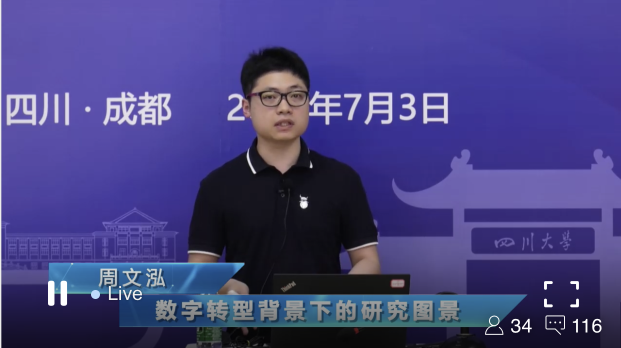 第四场讲座是周文泓副研究员关于《数字转型背景下的研究图景》的学术讲座。周老师以5G技术、人工智能、大数据中心、工业互联网、城际高速等新基建为例,强调数字转型正全方位变革人类世界的运行机制,并逐渐拓展人类世界的活动空间。他论述了数字转型的表现形态、提供的情境以及触发的学科议题群。他提出数据科学的重要性,并倡导同学们学会把数据变成知识、变成技术、变成工具,应用于研究。