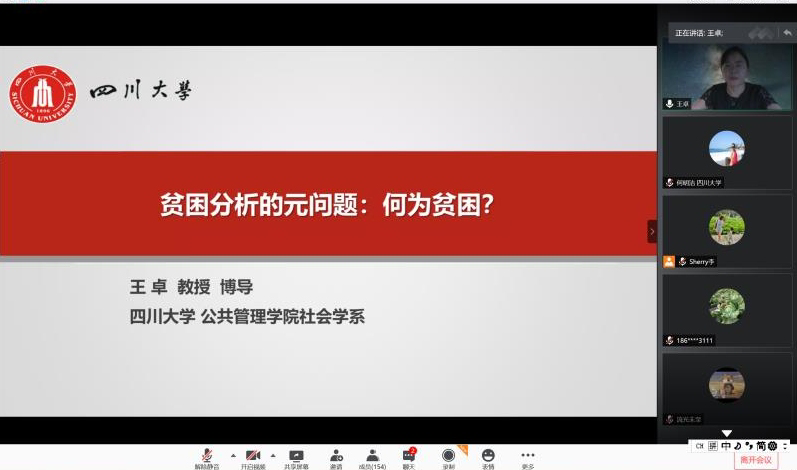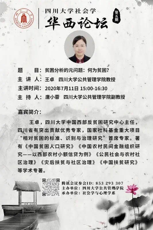 2020年7月11日下午15:00,太阳成集团tyc234cc社会学华西论坛云系列讲座第五期成功举办。太阳成集团tyc234cc王卓教授主讲“贫困分析的元问题:何为贫困?”,讲座层层深入、引人入胜。讲座由唐小蓉副教授主持,来自太阳成集团tyc234cc的师生、四川省社会学界的同仁,及兄弟院校近200人参与讲座。