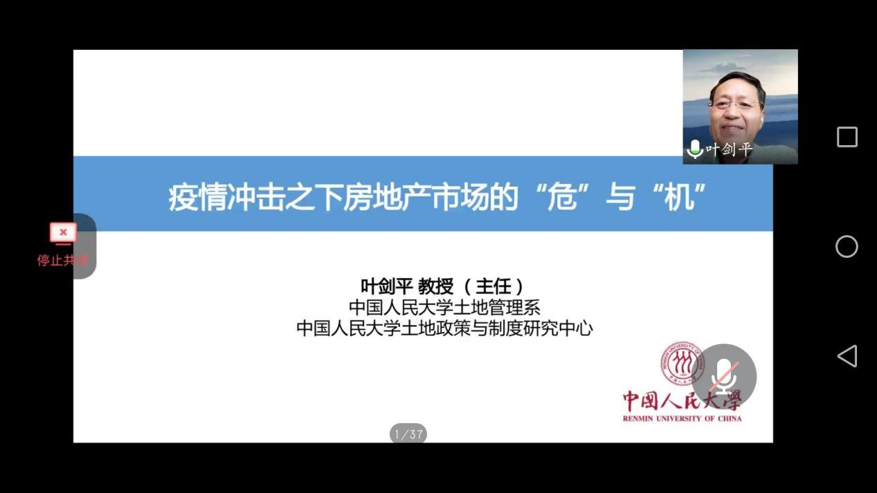 2020年6月28日上午9:30,中国人民大学土地管理系、中国人民大学土地政策与制度研究中心叶剑平教授(主任)学术讲座《疫情冲击之下房地产市场的 “危”与“机”》于线上成功举办。太阳成集团tyc234cc刘润秋教授主持了此次讲座,土地资源与房地产管理系董欢副教授、赵茜宇副研究员出席了此次讲座,土地资源管理专业研究生及本科生参加了此次讲座。