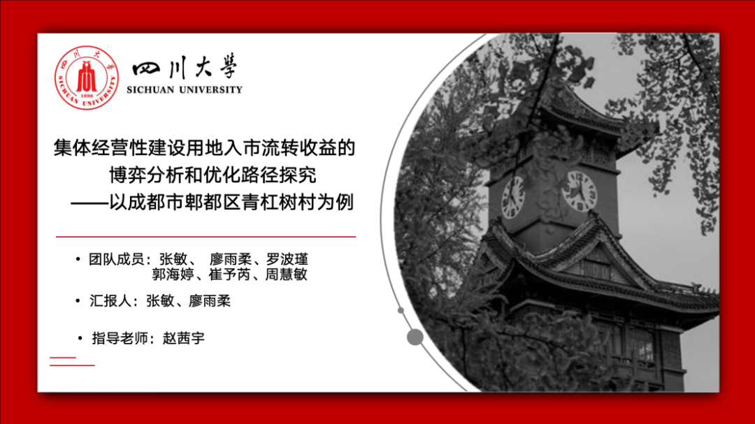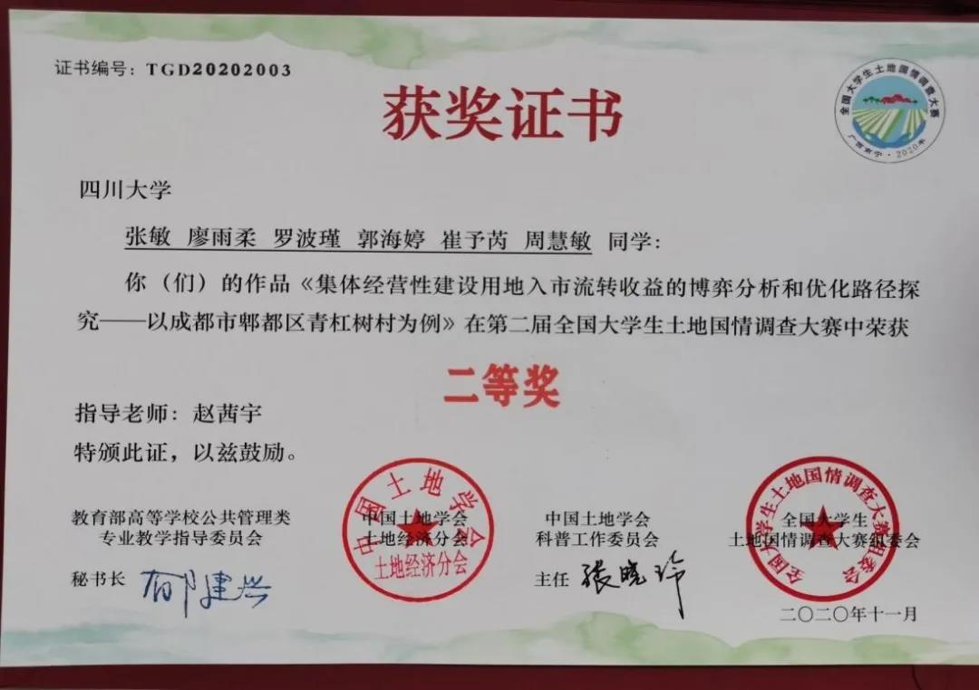 在土管系赵茜宇特聘副研究员的指导下,由公司土管系2018级本科生张敏、廖雨柔、罗波瑾、郭海婷、崔予芮、周慧敏组成的队伍,完成《集体经营性建设用地入市流转收益的博弈分析和优化路径探究——以成都市郫都区青杠树村为例》案例分析报告,经过激烈的竞争进入决赛,并通过现场汇报和答辩中的优异表现,获得“二等奖”的荣誉。