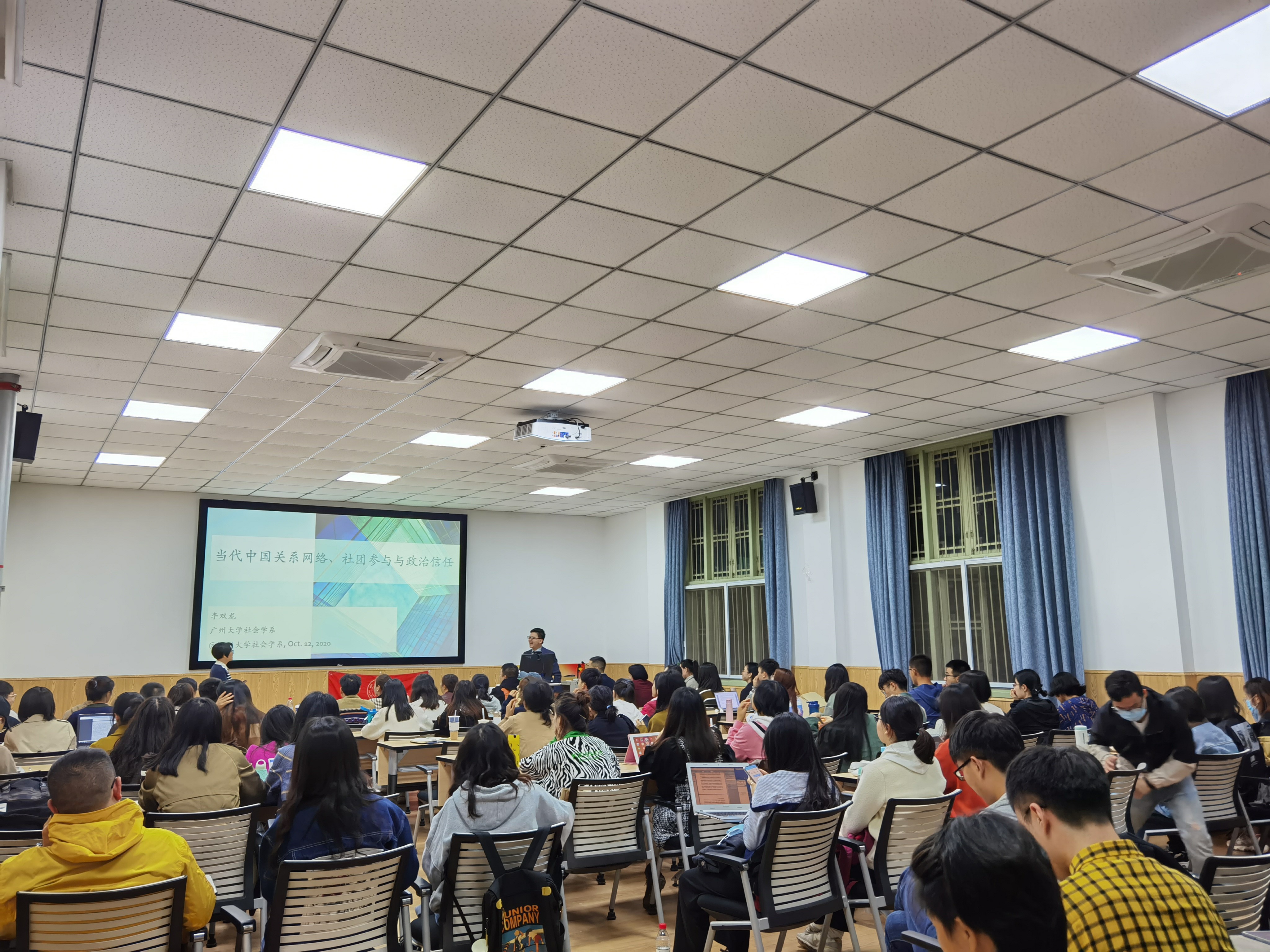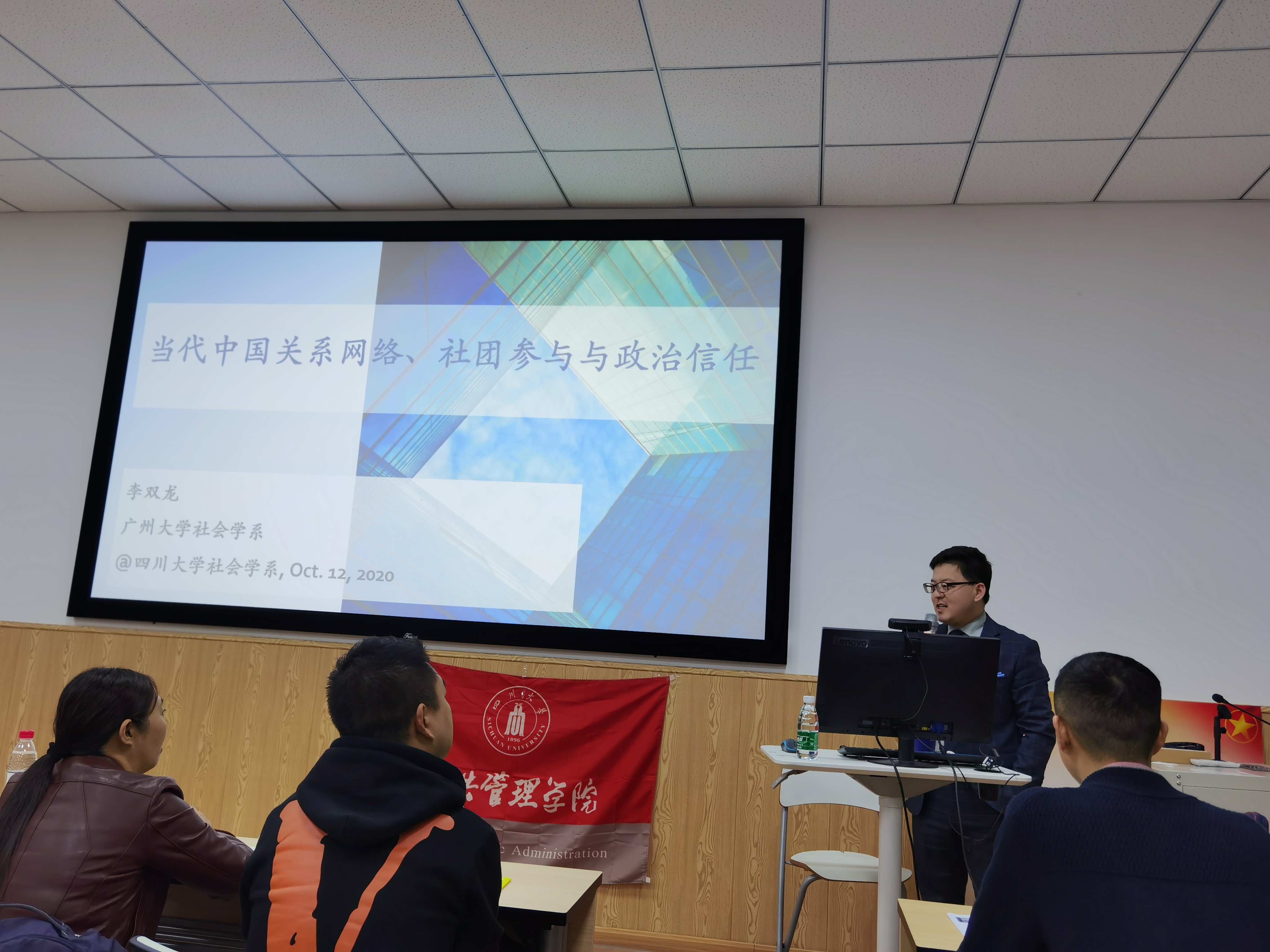 2020年10月12日晚上7点,太阳成集团tyc234cc社会学·华西论坛系列讲座第八期成功举办。广州大学社会创新研究中心副主任、社会学系李双龙副教授在公司106报告厅开展了主题为“当代中国的关系网络、社团参与和政治信任(Guanxi Networking, Associational Involvement, and Political Trust in Contemporary China)”的精彩讲座。讲座由社会学与心理学系郑莉副教授主持,社会学与心理学系、兄弟院校师生近百人参加了讲座。