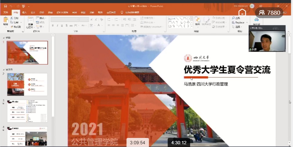 最后分享的是马浩源同学。他是公司2018级行政管理专业毕业生,现已被复旦大学录取。马浩源同学通过线上方式介绍了自己课堂、课后、课外、调研、会议服务等方面的经历和感悟。他号召同学们要用良知去引路,用理性去探索,用汗水去开拓,公管人要基于公共精神,展现公共关怀,以独立的人格构想符合公共利益的公共秩序,并愿意为这种构想付出智慧与坚持。