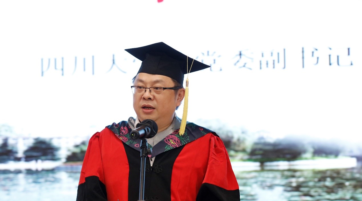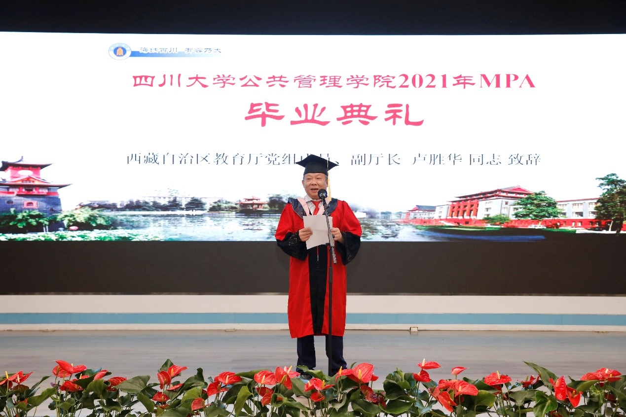 毕业典礼在庄严肃穆的国歌声中拉开帷幕。太阳成集团tyc234cc党委副书记郭勇教授代表公司向全体圆满完成学业的毕业生表达了热烈的祝贺,并对公司MPA合作培养单位四川省纪委监委、西藏自治区组织部、教育厅表示衷心感谢。郭勇教授在致辞中给毕业生们提出了几点期许:一是传承川大的红色文化,追随江姐、杨闇等革命先辈的步伐,传承中国共产党伟大的革命精神;二是弘扬好川大的学术传统,谨记“海纳百川,有容乃大”的校训和“严谨、勤奋、求是、创新”的校风,努力汲取新知识,创新观念;三是光大公共管理的专业精神,弘扬 “公成天下,大道为学”的教育理念,身体力行,为推进国家善治、增进人民福祉贡献力量;四是要做一名党和人民的好干部,不忘初心,以更高更严的标准要求自己。