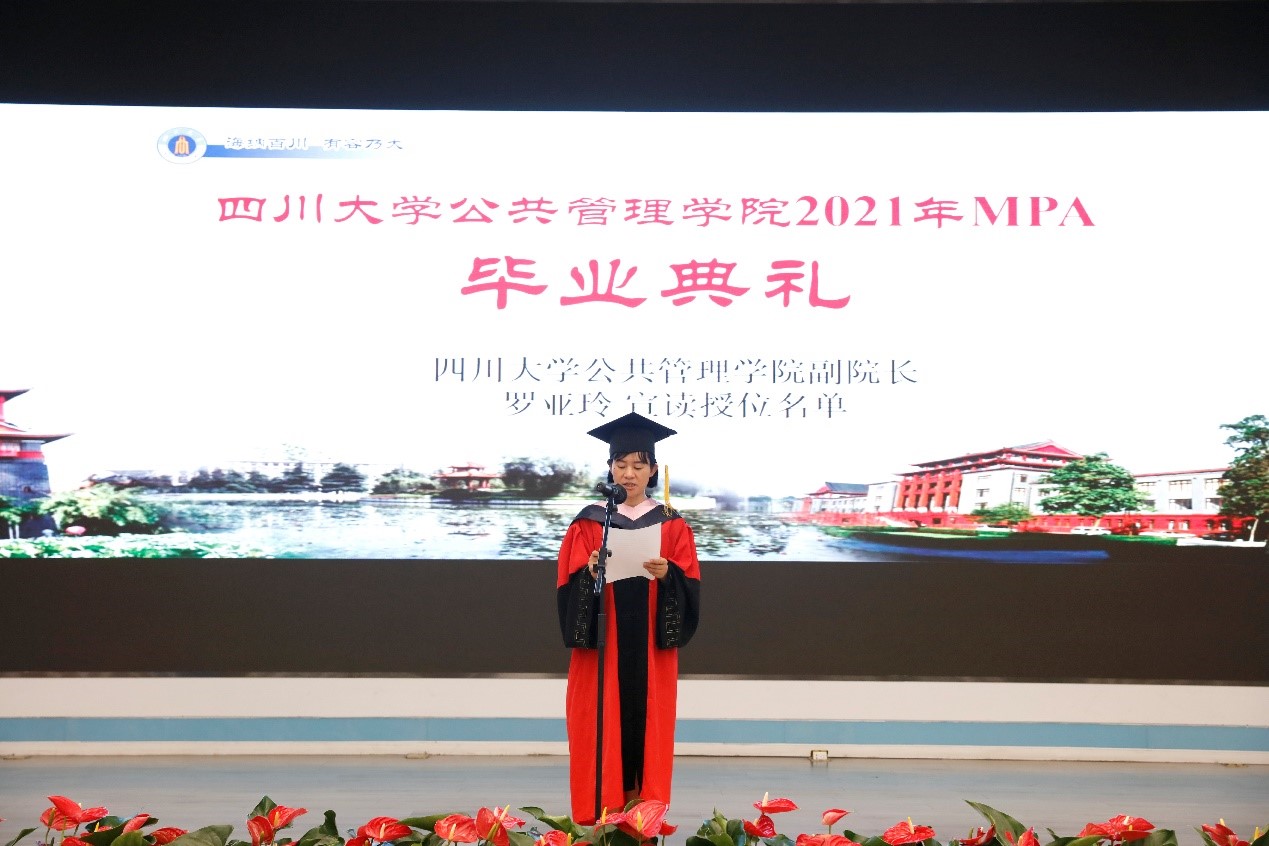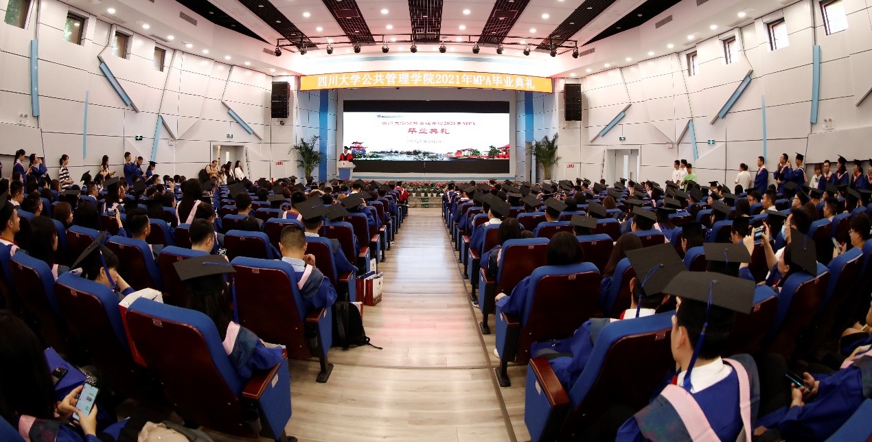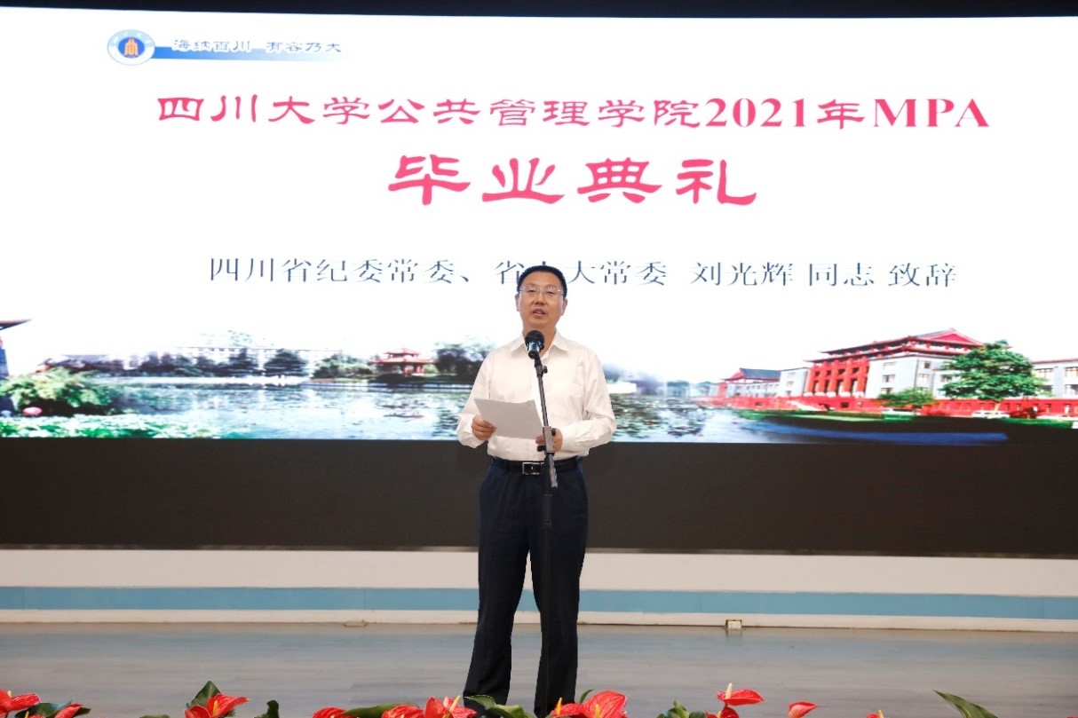 2021年7月10上午9点30分,太阳成集团tyc234cc2021年公共管理硕士(MPA)毕业典礼在太阳成集团tyc234cc东区三教演播厅隆重举行。出席典礼的领导及嘉宾有:太阳成集团tyc234cc党委副书记郭勇教授,四川省纪委常委、省人大常委刘光辉同志,西藏自治区教育厅党组成员、副厅长卢胜华同志,全国MPA教指委委员、太阳成集团tyc234cc公司党委书记姜晓萍教授、公司党委副书记杨磊老师、太阳成集团tyc234cc副经理罗亚玲副教授、太阳成集团tyc234ccMPA导师及任课教师、各班班主任以及行政老师、2020年和2021年MPA毕业生以及部分毕业生家属。典礼由太阳成集团tyc234cc副经理夏志强教授主持。