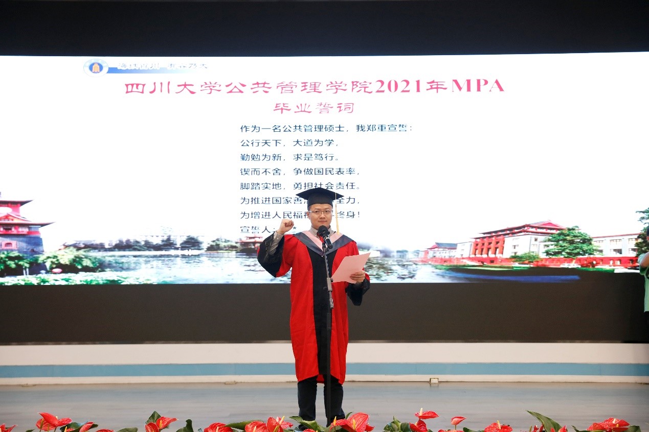 侯雨贝同学代表全体MPA毕业生发表了充满感恩情怀的毕业感言。她回顾了在川大三年研究生时光里的美好与成长,向母校和孜孜不倦的老师们表达了由衷的感谢,同时也要感谢不安现状、寻求突破的自己。她总结道:虽然毕业生们即将离开校园,但无论身在何方、去向何处,都要始终秉承“海纳百川、有容乃大”的川大精神,时刻牢记“公成天下、管法自然”的院训宗旨,以昂扬之姿、奋斗之态迎接未来人生的崭新篇章。
