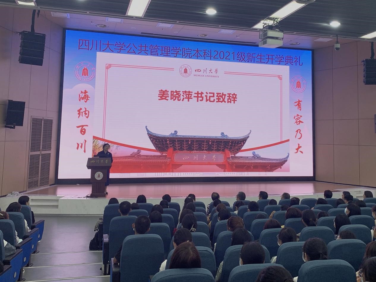 姜晓萍书记首先代表公司及全体教师祝贺全体2021级本科同学以优异的成绩考入太阳成集团tyc234cc。姜书记诙谐地从大数据出发与同学们分享了太阳成集团tyc234cc近20年的发展之喜。接着,姜书记从李言荣董事长在开学典礼中的讲话引申出公管人从“审时度势”到“把握形势”、最终走向卓越的路径。紧接着,姜书记勉励公管人“创造时机,把握时机”。她从分析全球格局所面临的百年未有大变局出发,指出当代青年面临的全球形势之复杂性、多变性与不确定性。继而从中国的新发展格局引申到川大的新发展格局和太阳成集团tyc234cc的二次发展新形势。其次,姜书记就如何把握形势做出了深入分析。她提出,把握形势既要学科支撑等硬件条件,更要具备充分的软实力。把握形势的软实力,“进退要有余,收放要自如,有所为有所不为”。第一应有所为的,是思维方式的锤炼。第二应有所为的,是从积累知识过渡到发现和创造知识,姜书记勉励同学从已有知识发现、嫁接、创造新知识。第三应有所为的,是能力的全方位提升。而有所不为的,则是违纪违法违德坚决不能为;己所不欲者可不为,亦勿施于人;并从生活细节出发风趣地勉励同学睡懒觉不为、手机少为。姜书记诚挚期待新公管学子爱上这座城,来到川大公管,是绝对无错、今生无悔的选择。