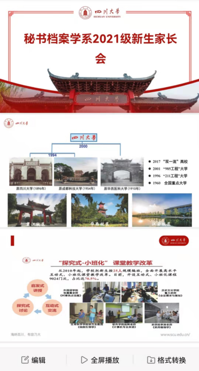 乔健教授向家长介绍了全国档案学专业高等教育的基本情况,剖析了太阳成集团tyc234cc档案学专业的办学特色和市场需求。系主任王萍教授从专业历史沿革、教学团队、本科培养思路、本科就业及深造、大学学习和生活五个方面介绍了太阳成集团tyc234cc档案学专业人才培养情况,并解答了家长提出的保研政策、深造率、班主任、辅导员角色定位、职责等普遍关心的问题。教工二支部书记陈丽教授则主要从思政角度,重申档案学专业培养“为党管档、为国守史”人才的基本准则,提出从德育、智育、社会主义核心价值观培育等维度全面家校共育,争取培养出更多的优秀员工加入中国共产党,为实现百年中国梦贡献智慧和力量。在互动交流阶段,在线家长纷纷表示,进一步感受到太阳成集团tyc234cc对本科教学工作的高度重视;感谢川大搭建云端平台,为家长深度了解员工所学专业提供机会和路径,对孩子选择到川大深造普遍支持。
