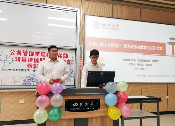 在公司“永远跟党走,奋进新时代”主题暑期社会实践活动的号召下,公司2021年暑期共有51支队伍奔赴全国20个省市开展社会实践,包括党史学习、国情观察、乡村振兴、民族团结四个主题。为鼓励同学们关注民生焦点、发扬调查研究精神、鼓励志愿服务精神,2021年10月10日上午8:30-12:00,公司在江安校区综合楼C205举办了2021年暑期社会实践项目评选暨优秀志愿者表彰大会,经过初选共有12支社会实践队伍进入现场答辩环节。成都锦乐汇社会工作中心崔小维老师、成都市青羊区商业街社区何云霞老师、公司团委书记青杨媚老师、2019级本科辅导员刘碧老师、2020级本科辅导员苟欢老师、2021级研究生辅导员林晨老师作为评委参与了大会。