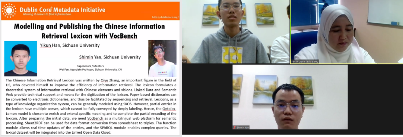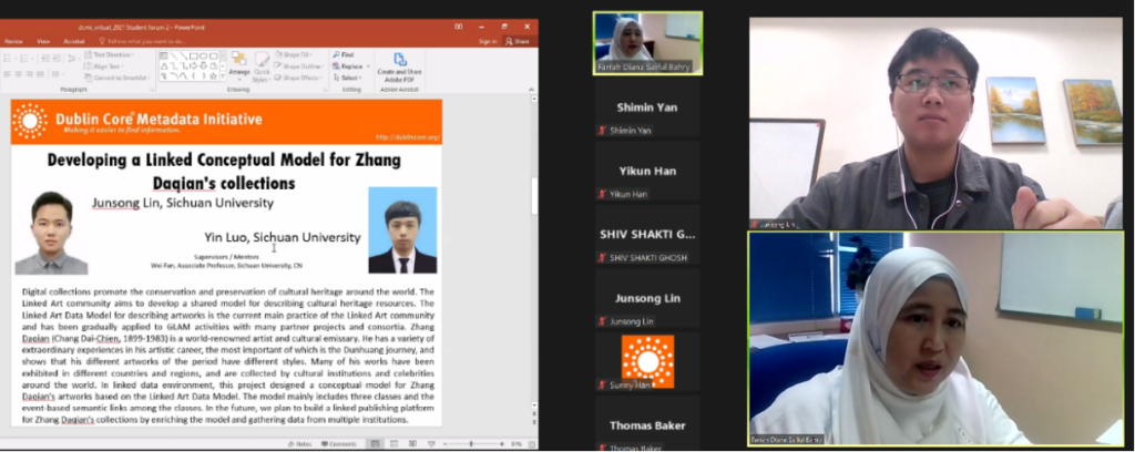 此次会议首次设员工论坛,旨在鼓励新生代的元数据专业人才培养,支持员工分享学术成果,提供员工与业界专家交流的机会。信息管理技术系系主任范炜副教授指导的2020级情报学研究生林君松、2019级图书情报研究生罗银和2019级信息资源管理本科生韩颐堃、鄢世民在员工论坛2(亚太地区)分别汇报交流了他们的项目阶段性成果。