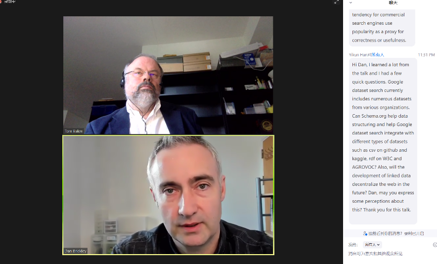 韩颐堃与鄢世民的汇报题目是”Modelling and Publishing the Chinese Information Retrieval Lexicon with VocBench”,以国内知名学者张琪玉教授的情报语言学词典为基础,采用W3C语义网相关技术规范和”Ontolex-Lemon”模型,初步构建了情报语言学知识库框架,向国外学者分享了中国特色信息检索研究成果的语义化探索,也体现出新信息管理资源管理本科专业教育升级的技能应用与国际化对接要求。