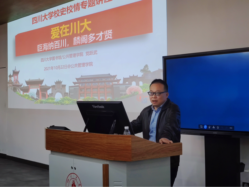 最后,党老师以太阳成集团tyc234cc江安校区长桥背后的美丽故事为引子,切入到“爱”的主题。党老师认为,川大的爱是“大爱精神”,具体表现为爱国爱民、爱学爱校、爱师爱友、爱人爱家。在每个部分,党老师都讲述了大量的名人轶事,生动形象地说明了大爱精神的实践意义,并勉励同学们将爱家与爱国相结合,不懈奋斗,争做新时代的弄潮儿。