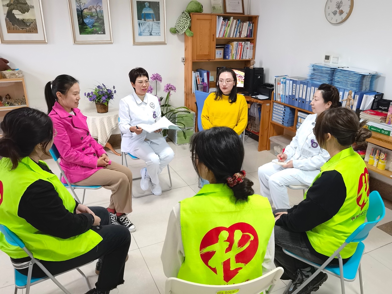 首先,崔珂老师和袁芮老师向两位院方督导和同学们询问了具体实习内容,了解到院方为实习项目做了丰富充实的安排。前九周,员工通过体验式学习,在带习老师的指导下,多次主持团体心理辅导和正念松弛训练,并为患者进行问卷评估和一对一访谈;后三周,轮转至一楼门诊大厅提供导医服务。同学们纷纷表示自己在实习过程中收获颇丰,对社会工作实务有了更深入的认识,实现了将理论知识付诸于实践的成长。两位院方督导充分肯定了同学们的出色表现与专业反思。