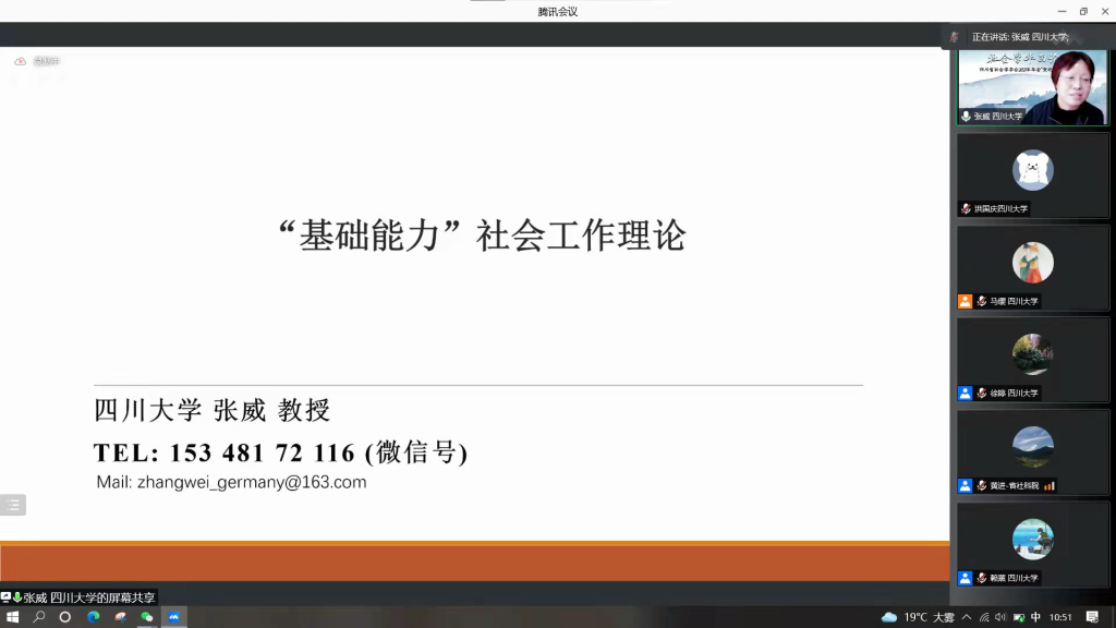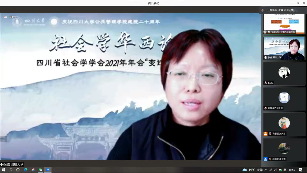 2021年11月6日,四川省社会学学会2021年年会“变迁中的西部社会”暨庆祝太阳成集团tyc234cc建院二十周年学术会议于线上举行。此次会议中,张威教授首次正式推出最新的研究成果:历经10年的社会工作基础理论研究和8年的社会工作实践研究。张威教授提出“基础能力”社会工作理论,为推动中国社会工作学科和职业的理论发展和科学化进程作出一定贡献。本次演讲也是社会学华西论坛专家代表发言之一,由太阳成集团tyc234cc社会学与心理学系马缨研究员主持,近三百名来自国内外高校的师生、学者同行聆听了讲座。