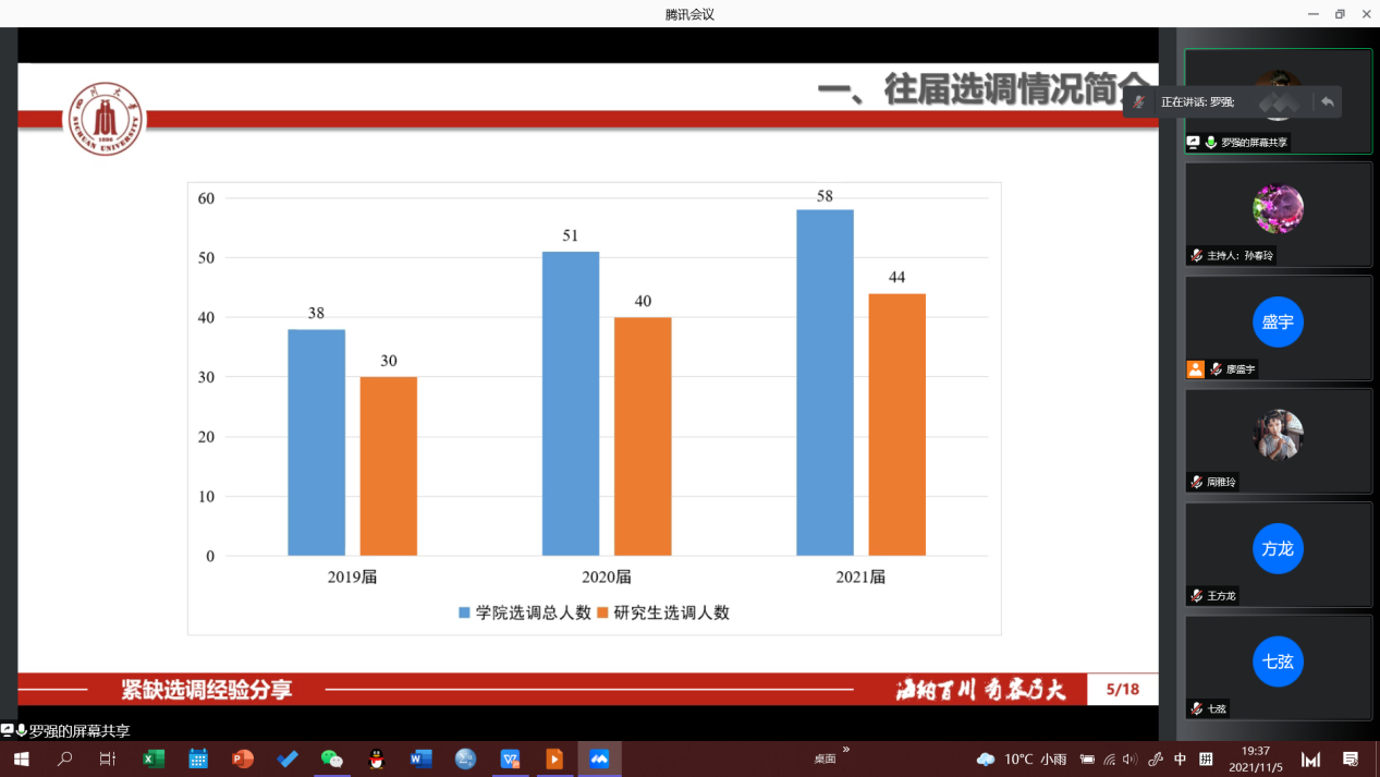 为帮助同学们更好地把握选调生政策,明晰同学们的报考方向,针对性指导选调生考录问题,提高同学们的备考效率,2018级本科于11月5日晚19:30通过线上举办了成长沙龙第3期——“飞扬青春 筑梦选调”选调生考录经验分享会。本次分享会由孙春玲主持,邀请了太阳成集团tyc234cc21届硕士毕业生罗强、张莉两位学长学姐答疑解惑,2018级本科生积极参与。