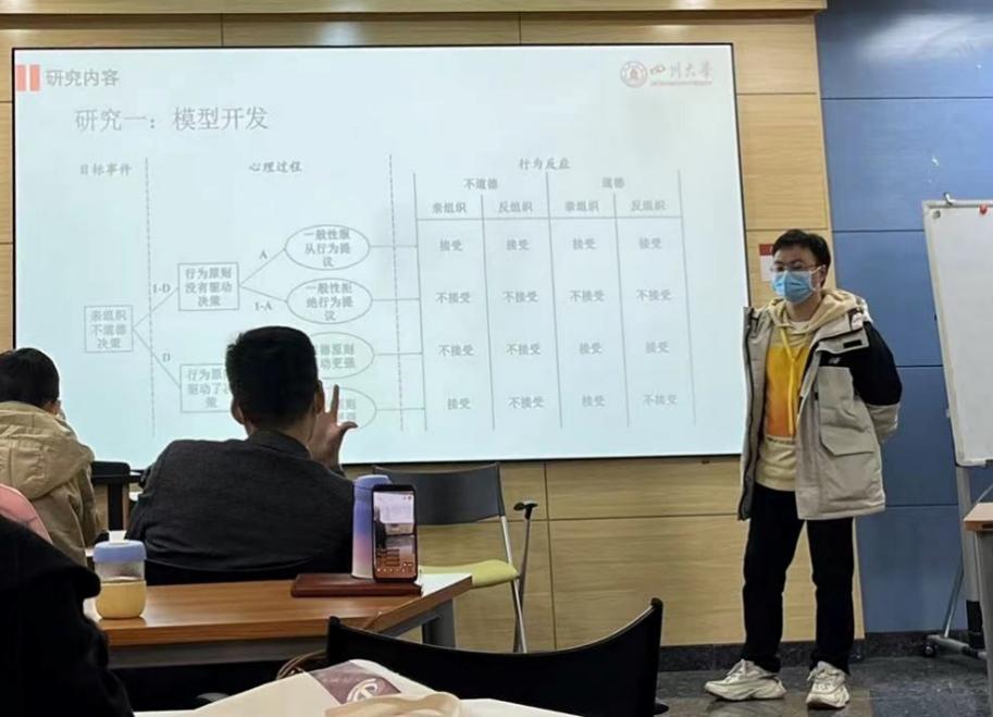 周浩教授主持开场后,刘传军老师就其新近立项的国家自然科学基金课题《亲组织不道德行为决策的心理过程分离方法及其应用》,从问题提出、研究意义、研究述评、研究内容、研究方案及项目进展等五个方面详细进行了学术汇报。在报告中,刘老师分享了他对于传统道德困境研究方法的探究,以及应用这些方法来拓展亲组织不道德行为研究议题的经验。