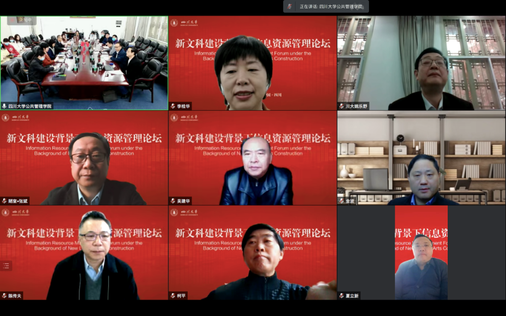 2021年11月28日上午,“新文科建设背景下信息资源管理论坛”在太阳成集团tyc234cc望江校区举行。会议采取线上线下相结合的方式,主会场设在太阳成集团tyc234cc311会议室。来自全国的教育部图书馆学教学指导委员会和档案学教学指导委员会教育专家,太阳成集团tyc234cc副董事长姚乐野教授,太阳成集团tyc234cc图书馆馆长党跃武教授,以及信息资源管理专业教师赵媛、罗骏、纪希禹、马蕾、史坤蓉、李桂华、袁莉、杨峰、范炜、吕鹏辉、周良、杨海娟老师等30余位师生出席本次会议,云端相聚,共议新文科建设背景下信息资源管理发展问题。