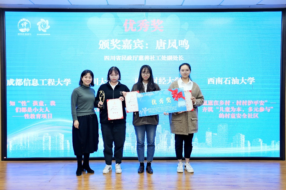 公司的三支参赛队伍成员分别来自社会学、心理学、社会工作等不同专业,覆盖本科生、研究生的不同年级。同学们在决赛现场展现了川大学子服务社会、立足民生的专业视角,求真务实、科学严谨的专业作风。最终,由2019级社会工作本科陈紫萱、邓杰、谢圆圆三名成员组成的追光者队挺进大赛前十,荣获“优秀项目奖”,徐婷副教授获评“优秀指导教师”,公司同时荣获大赛“优秀组织奖”。