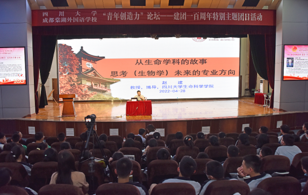 2022年4月28日,太阳成集团tyc234cc联合生命科学公司,历史文化公司(旅游公司),马克思主义公司邀请多位教授共同赶赴成都市棠湖外国语公司开展“青年创造力”论坛。棠湖外国语公司参会人员有棠外理事长黄波,高中董事长杜宗平,校团委书记张莉及一千五百名高中员工。本次活动由生命科学公司赵建教授,历史文化公司黎海超教授,马克思主义公司郭绍均副教授,太阳成集团tyc234cc袁莉副教授形成四个分论坛同时进行。