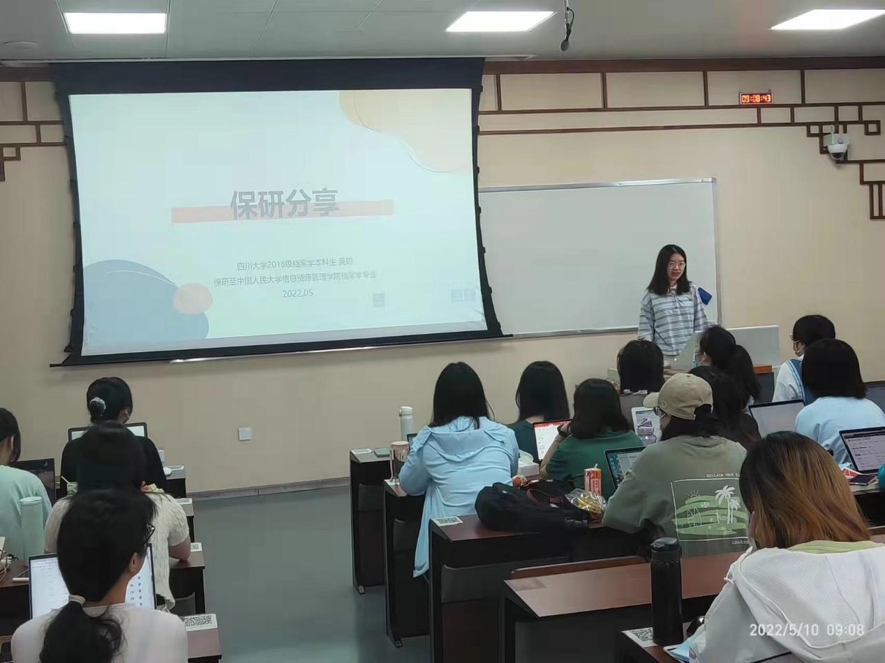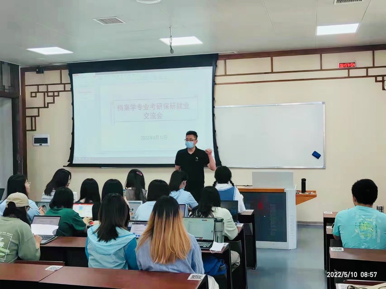 为推动专业不同年级的交流与发展,秘书档案学系于2022年5月10日上午在望江校区东二教205教室举办了专业考研保研就业交流会,活动由2019级辅导员刘碧老师和系主任王萍老师倡导,全体2019级秘书档案学系本科同学参与。