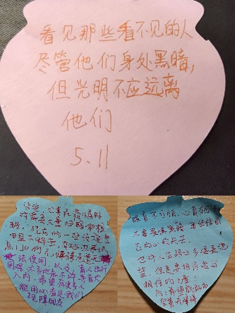 黑暗中对话,是与视障人士的对话,也是一场与自己内心的对话。活动结尾,同学们与导赏员进行了交流,为他们的坚强与乐观所感动,同时,对残疾人事业的发展有了更多的思考。许多同学表示,在黑暗中,导赏员为我们领路,回到光明,我们也可以发挥专业所长,成为视障人士守护者。当光明在黑暗后重现,其意义更为深刻,带着无尽的感慨,同学们在留言室写下体验感想与祝福。