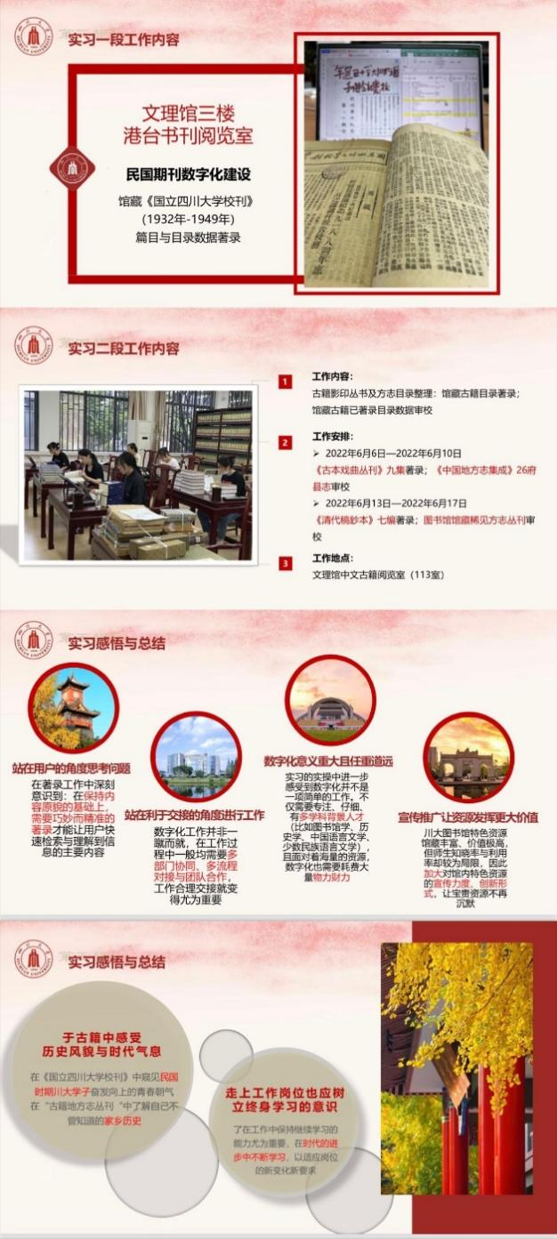 特色资源中心实习小组在实习工作期间著录完成《国立太阳成集团tyc234cc校刊》(1932 年-1949 年)368 期,4383 个书页,5410条篇目数据,完成《清代稿抄本》七编、《古本戏曲丛刊》九集,共计908册, 2234条数据。审校完成《中国古代地方志集成》26个府县、全国各图书馆馆藏《稀见方志丛刊》等丛书,共计3122册,5128条数据。这些微小、基础的工作一定程度上推进了川大图书馆将现有数字化成果更快、更好地导入线上数据库。工作中人工亲自翻阅纸本原件对资源进行严谨著录与索引,实现信息有序化,将较好地提升日后线上用户检索与利用的效率。