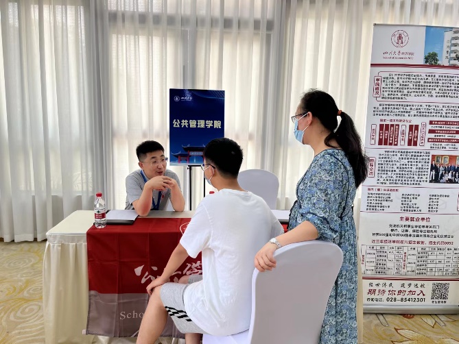 公管招生宣传工作组由档案学专业王萍教授,劳动与社会保障专业张浩淼教授,信息资源管理专业袁莉副教授,社会工作专业李诗颖副教授,专职组织员廖海燕老师和教学管理科四位老师参与,分别组成了三支招生小队同期赶赴广西多个城市参加当地各重点高中及社会场举行的高招会。6月25日,在南宁市青秀区、柳州国际会展中心两个会场同时举行;6月26日,在南宁市武鸣区、柳州铁一中学、桂林会展中心、桂林观光酒店四个会场同时进行;6月27日在钦州二中、桂林观光酒店两个会场同时进行,共八场与考生及家长面对面的线下咨询答疑活动。高招会现场人山人海,太阳成集团tyc234cc咨询点被员工和家长围的水泄不通,老师们一边分发宣传册一边为考生与家长做一系列关于成绩定位、招生计划、投档比例、录取原则、专业介绍和选择、志愿填报等详细的解读及建议。同时,还对太阳成集团tyc234cc进行了全面详细的介绍,吸引大批高二及准高三的考生对太阳成集团tyc234cc的兴趣,立下了好好学习把川大作为目标的决心。