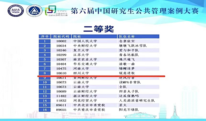 由姜晓萍教授和刘汪述垚、汪恒、吴边、宋怡然组成的“瞻星揆地”队凭借案例《再组织化:社区治理中居民主体性何以激活?——基于彭州市花村街的治理实践》荣获三等奖。