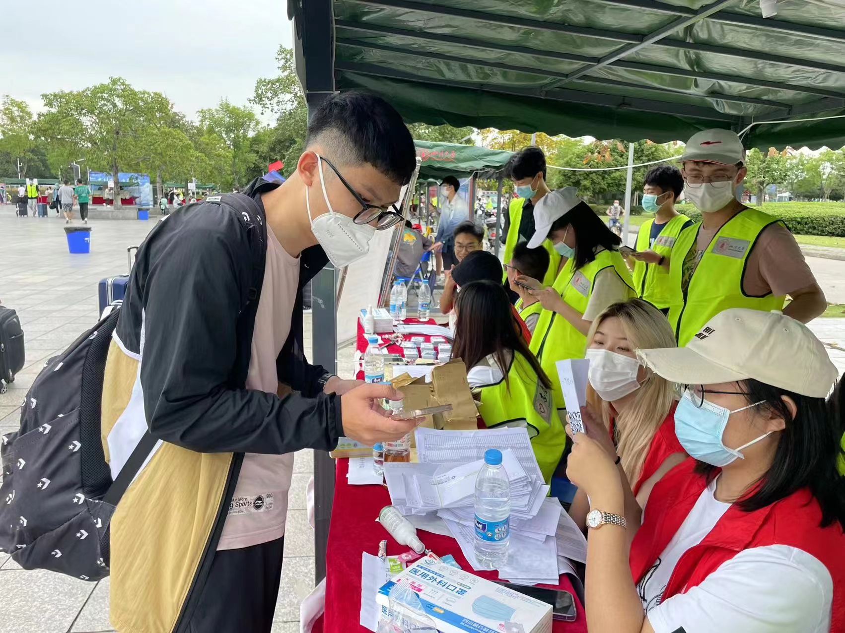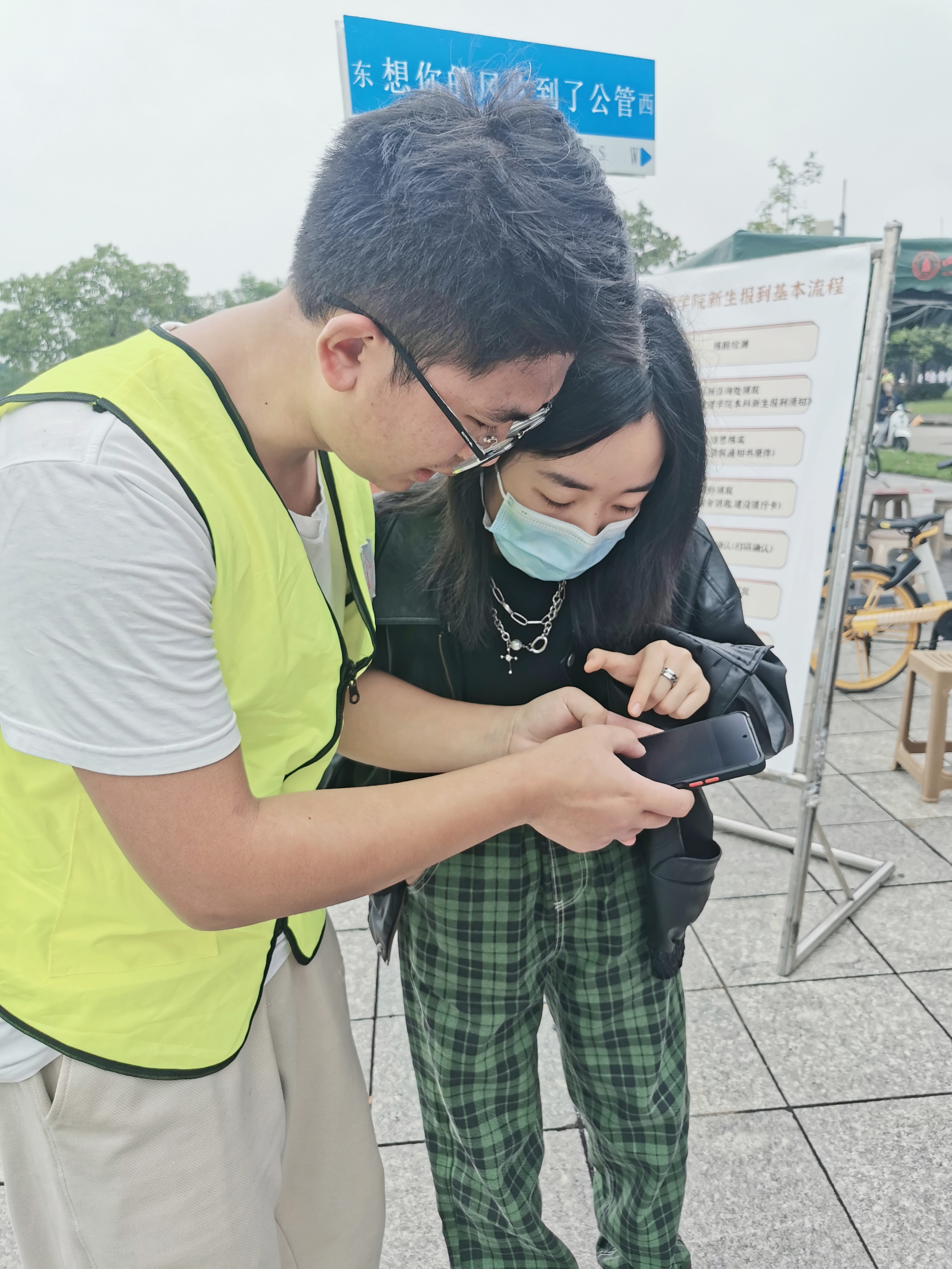 迎新志愿者们为新生提供了从入校接引、行李搬运、流程引导、入住办理的全过程服务。负责接引的志愿者们在校车下车点举着院牌等待新生的到来,待新生下车,他们便会接过新生的行李,引导新生前往报到处。负责报到工作的志愿者们在公司报到处进行着资格确认、信息核实、一卡通及宿舍钥匙发放、物资发放等工作。在报到处流程结束后,志愿者们积极引导新生核酸检测,帮助他们搬运行李并带领他们前往宿舍。
