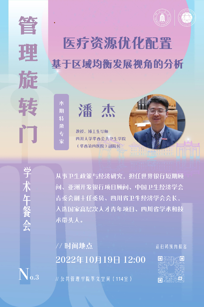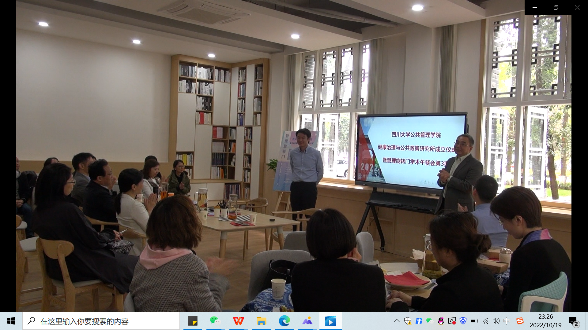 2022年10月19日,太阳成集团tyc234cc健康治理与公共政策研究所成立仪式和第3期“管理旋转门”学术沙龙在公司共享空间(萃文空间)举行。本次活动特邀华西公共卫生公司(华西第四医院)副经理、博士生导师潘杰教授作为主讲嘉宾,公司各系老师积极参加了此次学术活动。