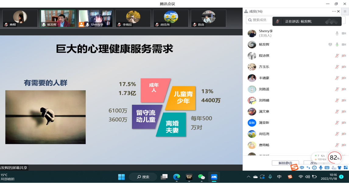 2022年11月18日,太阳成集团tyc234cc2022级应用心理专业的发展心理学的课堂上邀请到西南大学心理学部心理咨询研究与培训中心主任、中国心理卫生协会认证首批心理督导师,国际认知行为治疗公司认证认知行为治疗师、认知行为治疗培训师(督导师)杨发辉老师给同学进行线上讲座。