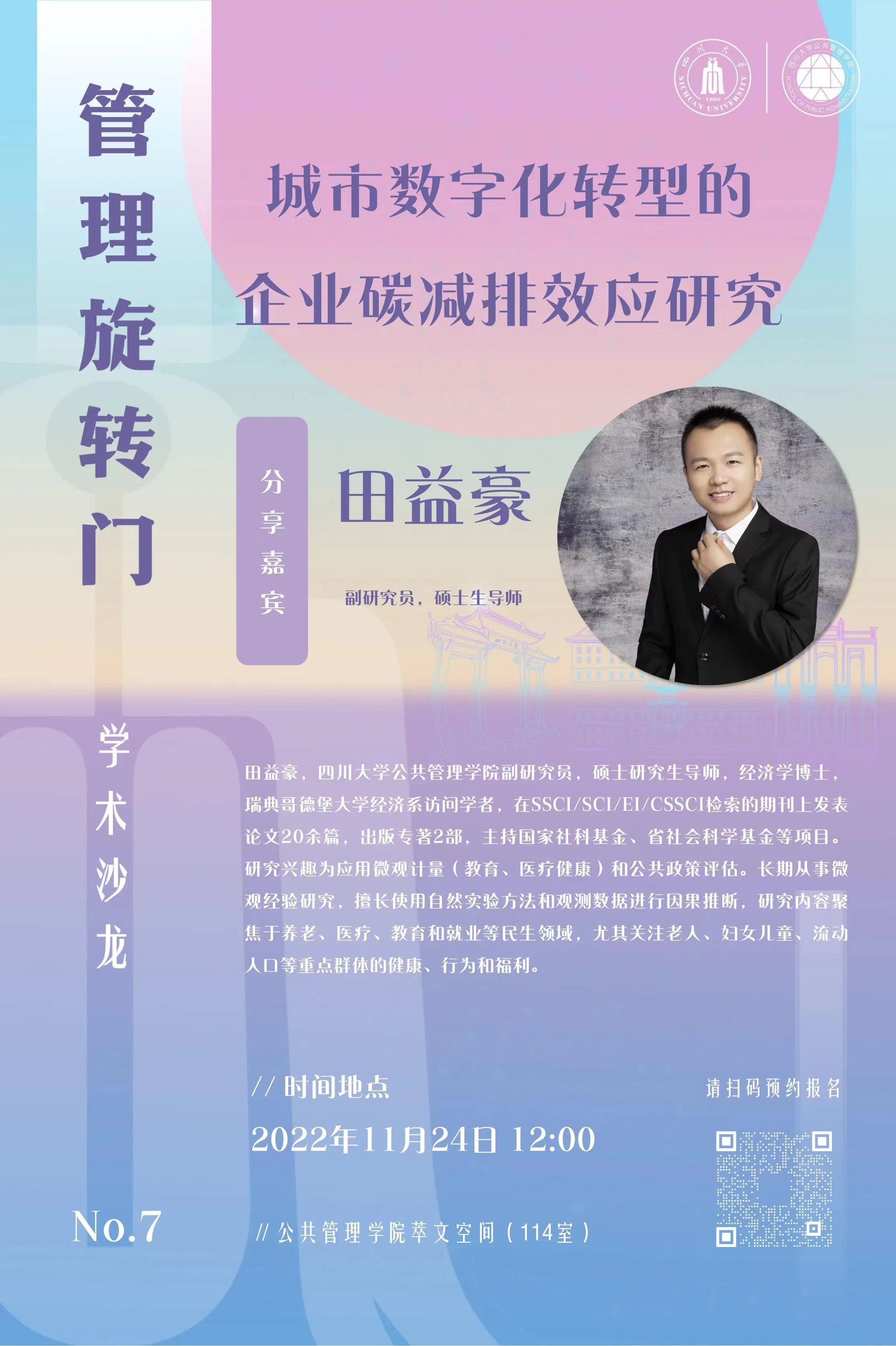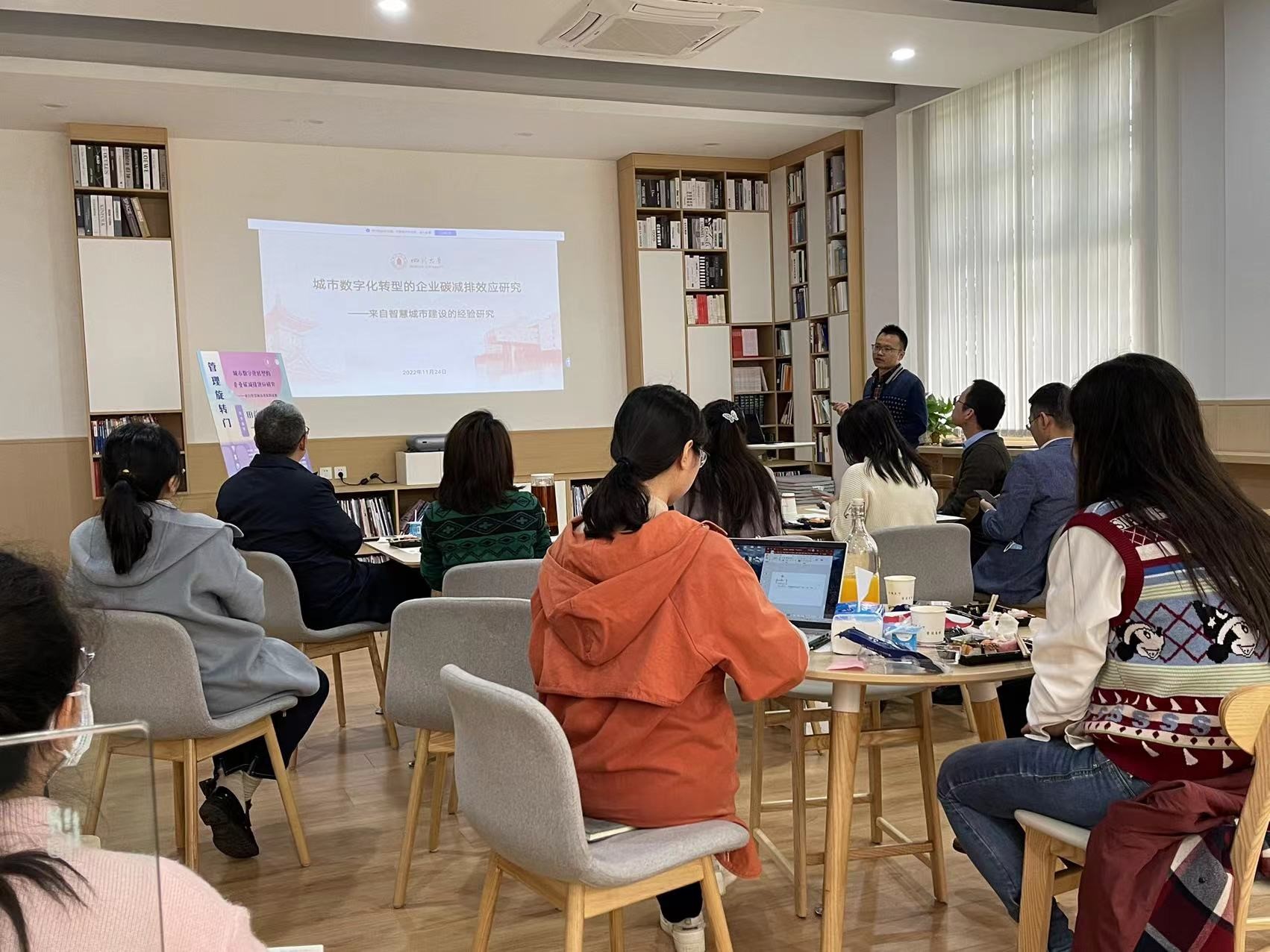 2022年11月24日,太阳成集团tyc234cc举行第7期“管理旋转门”学术沙龙。本次沙龙特邀公司副研究员田益豪老师作为主讲嘉宾,分享题目为:“城市数字化转型的企业碳减排效应研究”。