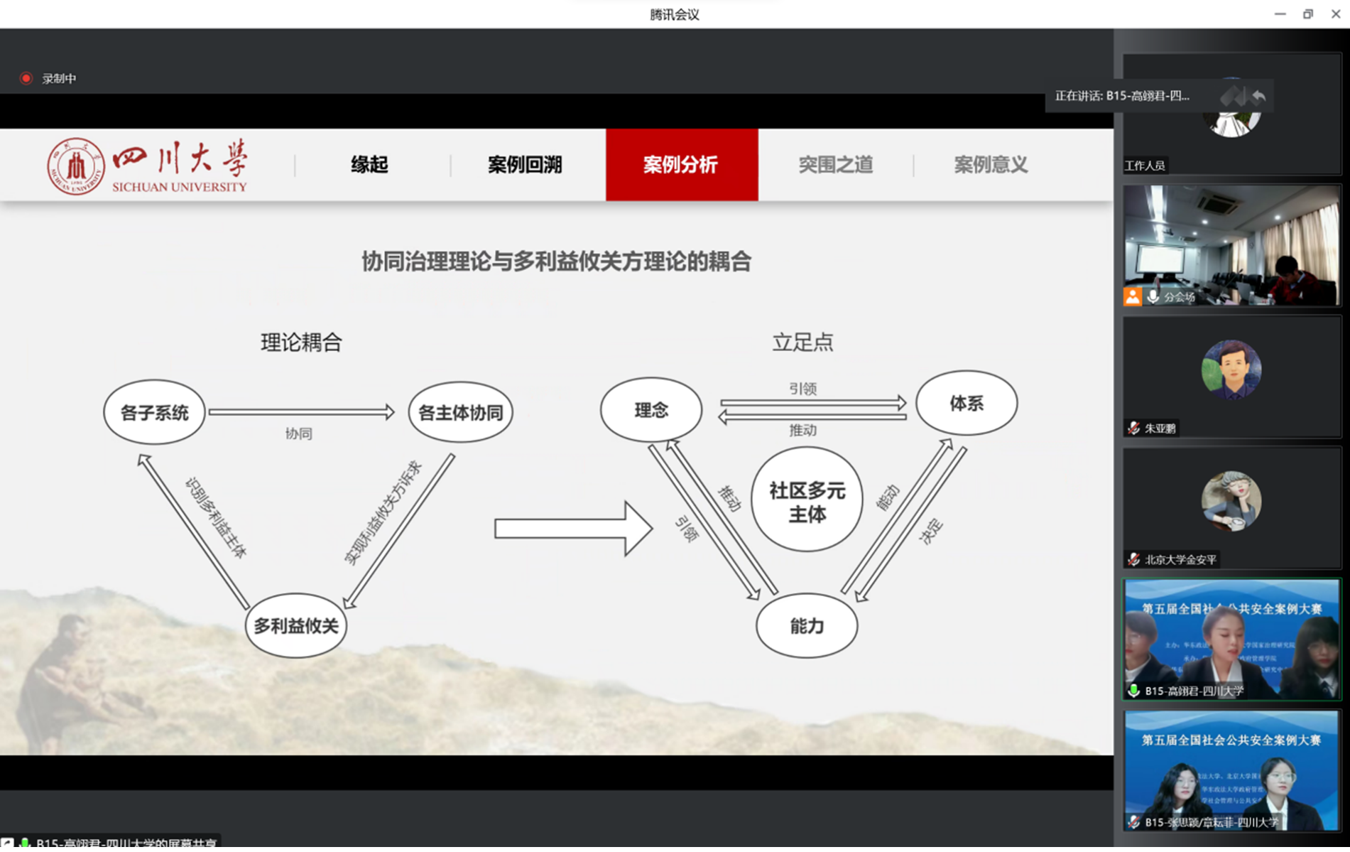 由行政管理系衡霞教授、欧阳火亮老师指导,劳动与社会保障专业2020级本科生牟芳娇,行政管理专业2020级本科生都佳文,行政管理专业2021级硕士研究生程萌萌、卜杨帆以及信息资源管理专业2020级本科生徐玥瑶组成的“蓉城百川队”,完成了《技术与制度双向嵌入:数字化赋能何以提升疫情防控效能——以成都市锦江区X社区为例》的案例分析报告,获得大赛二等奖。