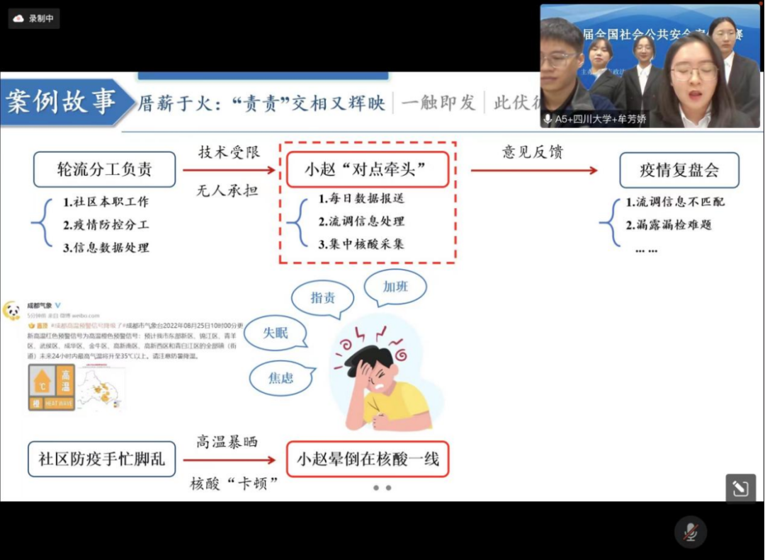 经过充分准备和激烈角逐,来自公司的两支员工队伍脱颖而出。由信息资源管理系的杨峰教授指导,信息资源管理专业2021级本科生高翊君、章耘菲、刘鑫雨、张思颖、雷青青组成的“花开富贵队”,完成了《从“爆红”到“暴洪”:“8•13”彭州山洪”事故中社区应急管理体系的困境与优化路径研究》的案例分析报告,并通过决赛现场8分钟的陈词环节和7分钟的答辩环节,表现优异,荣获大赛一等奖。