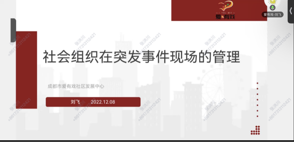 刘飞主任首先介绍了新时期我国突发事件的特点,详细阐述了突发事件应急管理的阶段与事故救援体系的构成,并就爱有戏实际参与的突发事件现场管理案例进行解释。在疫情防控中,爱有戏社区发展中心在党建引领下,充分发挥社会组织的优势,快速响应、做好社区防控需求的“补位者”,精准服务、突出疫情防控“服务者”角色,整合资源、做好志愿服务的“统筹者”,在疫情联系、社区摸排、志愿服务以及推动复工复产中发挥了重要作用。