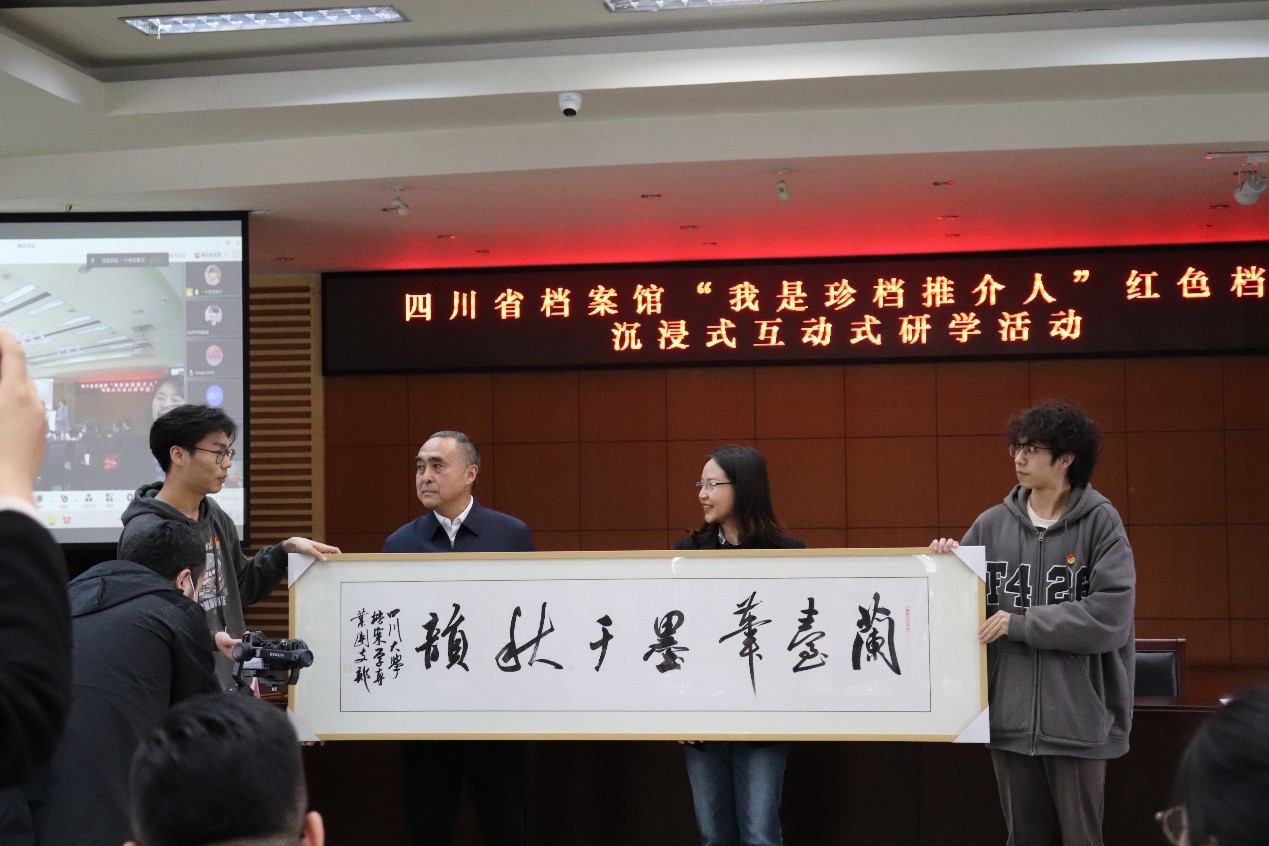 交流会的最后,档案班团支部以全体同学的名义赠送档案馆一幅书法作品——“兰台笔墨千秋韵”,“兰台”是档案管理机构的旧称,以表达对档案工作者的敬意和对四川省档案馆对本次活动支持的谢意。四川省档案馆也给太阳成集团tyc234cc教工和互动问答环节回答正确的同学赠送了相应的文创产品。