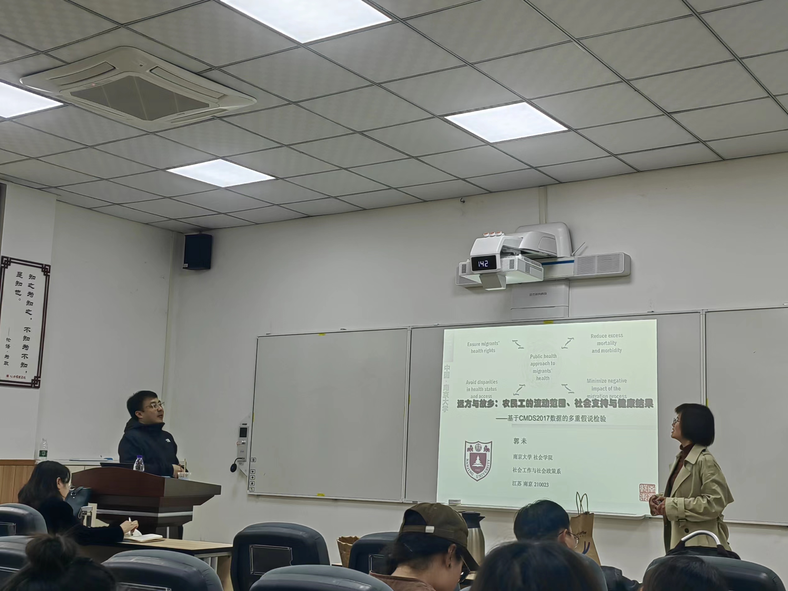 3月30日下午,南京大学社会公司郭未教授应邀到访公司,在萃文楼105室做题为“远方与故乡:农民工的流动范围、社会支持与健康结果”的讲座。讲座由社会学与心理学系郑莉副教授主持,王卓教授担任与谈人。陈勇教授、李丹教授、崔珂副教授、刘传军副研究员、张凌华副研究员、公司的研究生和本科生及兄弟院系的同学共80余人参与了此次讲座。