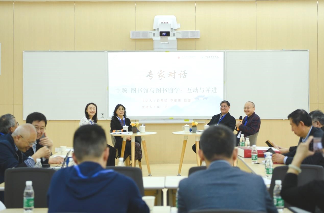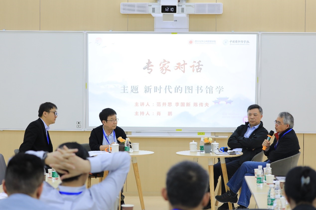 第二场专家对话的主题是“新时代的图书馆学”,华东师范大学信息管理系范并思教授、北京大学信息管理系李国新教授、武汉大学信息管理公司陈传夫教授展开交流,南开大学商公司于良芝教授以视频形式远程分享观点,中山大学信息管理公司肖鹏副教授主持。于良芝教授从底层逻辑概念回应了图书馆学基础内容,认为要借助诸如知识和信息等更基础的概念,从学科概念链条的前端重新科学和准确地定义图书馆;而由于图书馆学承载着文化内涵,也需要用文化、教育、科技等加以定义。范并思教授认为图书馆专业精神以服务为核心体现,图书馆需要通过学界和业界积极对外发声构建理念共识,将服务与彰显核心价值、使命相结合,推动理论和实践更好创新。李国新教授认为当前各类型图书馆差异进一步扩大,现有图书馆学理论不足以解释图书馆面临的实践问题,要充分警惕理论和实践脱节对学科发展的潜在威胁,应以实践问题为导向重构图书馆学理论基础;同时,以公共图书馆为代表的实践具有鲜明的中国特色,需要对其展开深入研究;陈传夫教授提出,图书馆就是要致力于塑造国民素质和文化精神,因而要通过制度保障图书馆专业精神;同时,图书馆学应认识到理论研究的重要性和多重功能,把握学科更名的发展机遇,坚定信念,扎根大地、联系实际,把图书馆学推向前进。扎根中国大地开展研究,凸显学科特色,构建学科共识,通过扩大自身贡献来提升学科话语权。