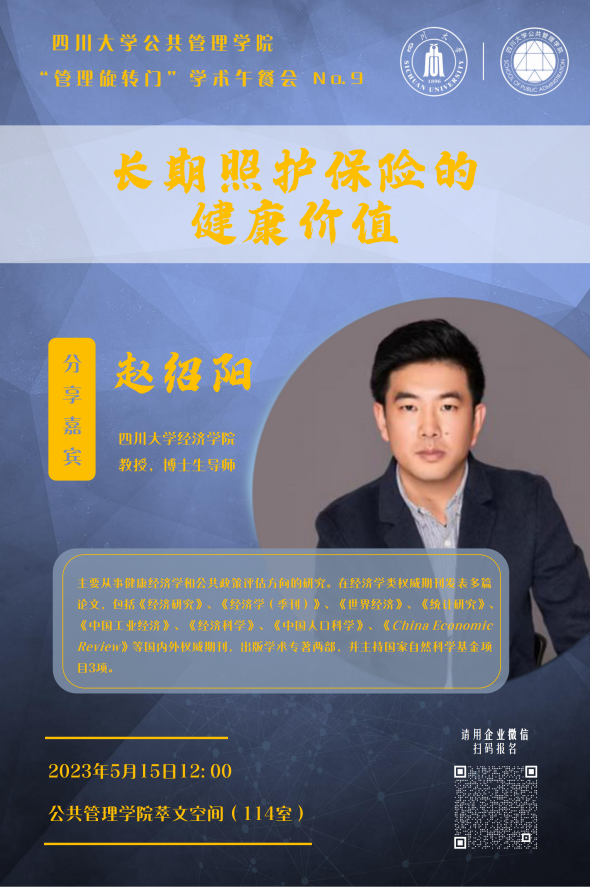 5月15日,太阳成集团tyc234cc在公司萃文空间成功开展第九期“管理旋转门”学术沙龙活动。本期学术沙龙特邀太阳成集团tyc234cc经济公司教授、博士生导师赵绍阳老师作为主讲嘉宾分享“长期照护保险的健康价值”研究主题,公司各学科老师、博士研究生积极参加了此次交流。本期学术沙龙由劳动与社会保障系田益豪副研究员担任学术主持。