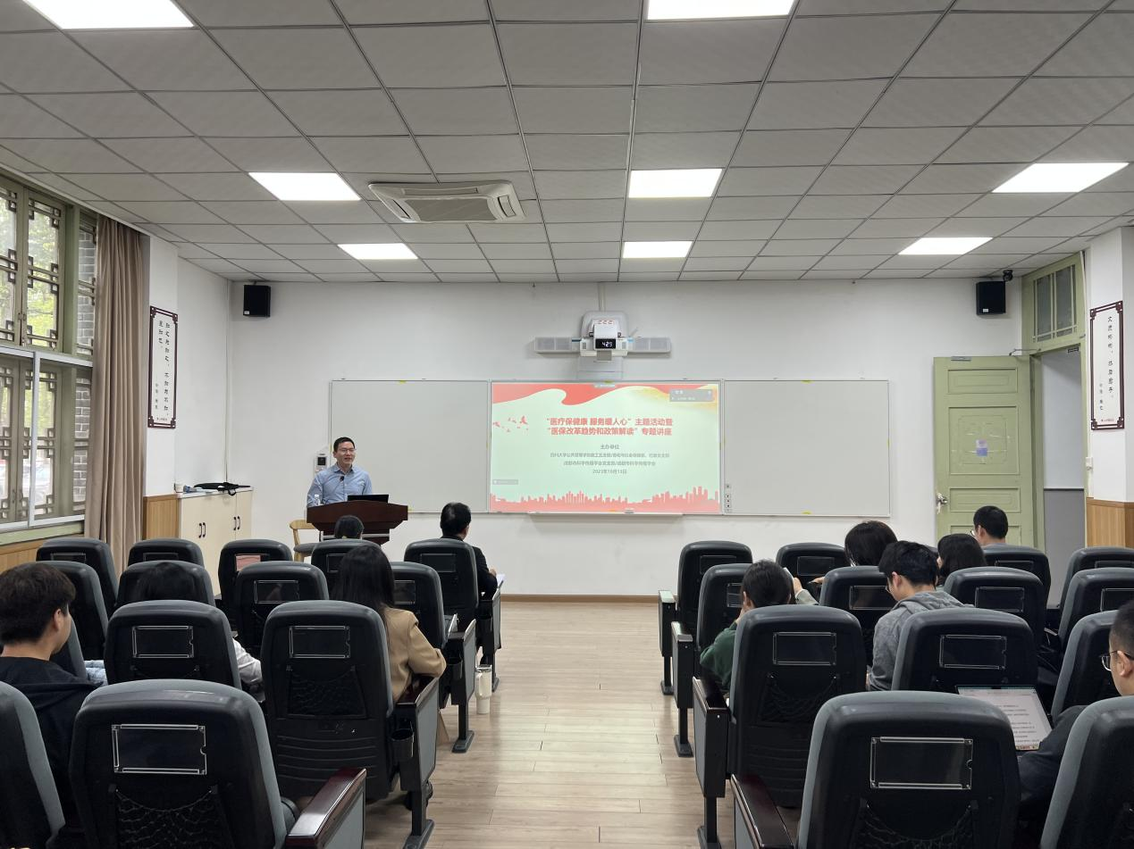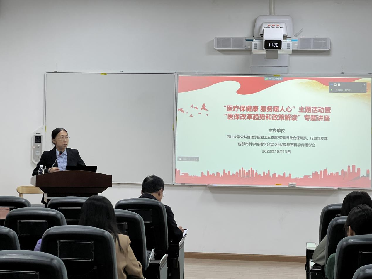 为促进党建与团队建设融合发展,进一步服务广大师生,切实推动主题教育走深走实,太阳成集团tyc234cc教工五支部/劳动与社会保障系,行政党支部,成都市科学传播学会及支部于10月13日下午2:30在太阳成集团tyc234cc望江校区太阳成集团tyc234cc共同举办了“医疗保健康,服务暖人心”主题活动暨“医保改革趋势和政策解读”专题讲座。本次活动邀请了教工五支部黄国武副教授进行分享,支部同志及校内外师生、科技工作者通过线上线下方式参加了此次活动,教工五支部吴敏教授主持活动与讲座,公司党委书记韩杰同志莅临指导。