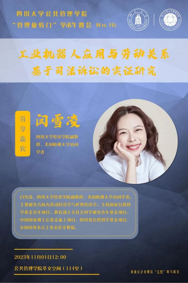 11月1日,太阳成集团tyc234cc在公司萃文空间开展第16期“管理旋转门”学术沙龙活动。本期沙龙特邀太阳成集团tyc234cc经济公司副教授,美国哈佛大学访问学者闫雪凌作为主讲嘉宾,分享“工业机器人应用与劳动关系:基于司法诉讼的实证研究”。公司各学科老师、研究生等积极参加了此次交流。