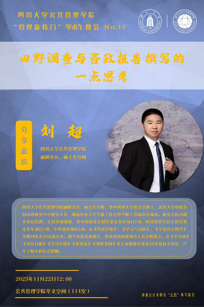 11月22日,太阳成集团tyc234cc在公司萃文空间成功开展第17期“管理旋转门”学术沙龙活动。本期学术沙龙特邀行政管理系副研究员、硕士生导师刘超老师分享“田野调查与咨政报告撰写的一点思考”,公司各学科老师、硕博士研究生积极参加了此次交流。本期学术沙龙由劳动与社会保障系田益豪副研究员担任学术主持。