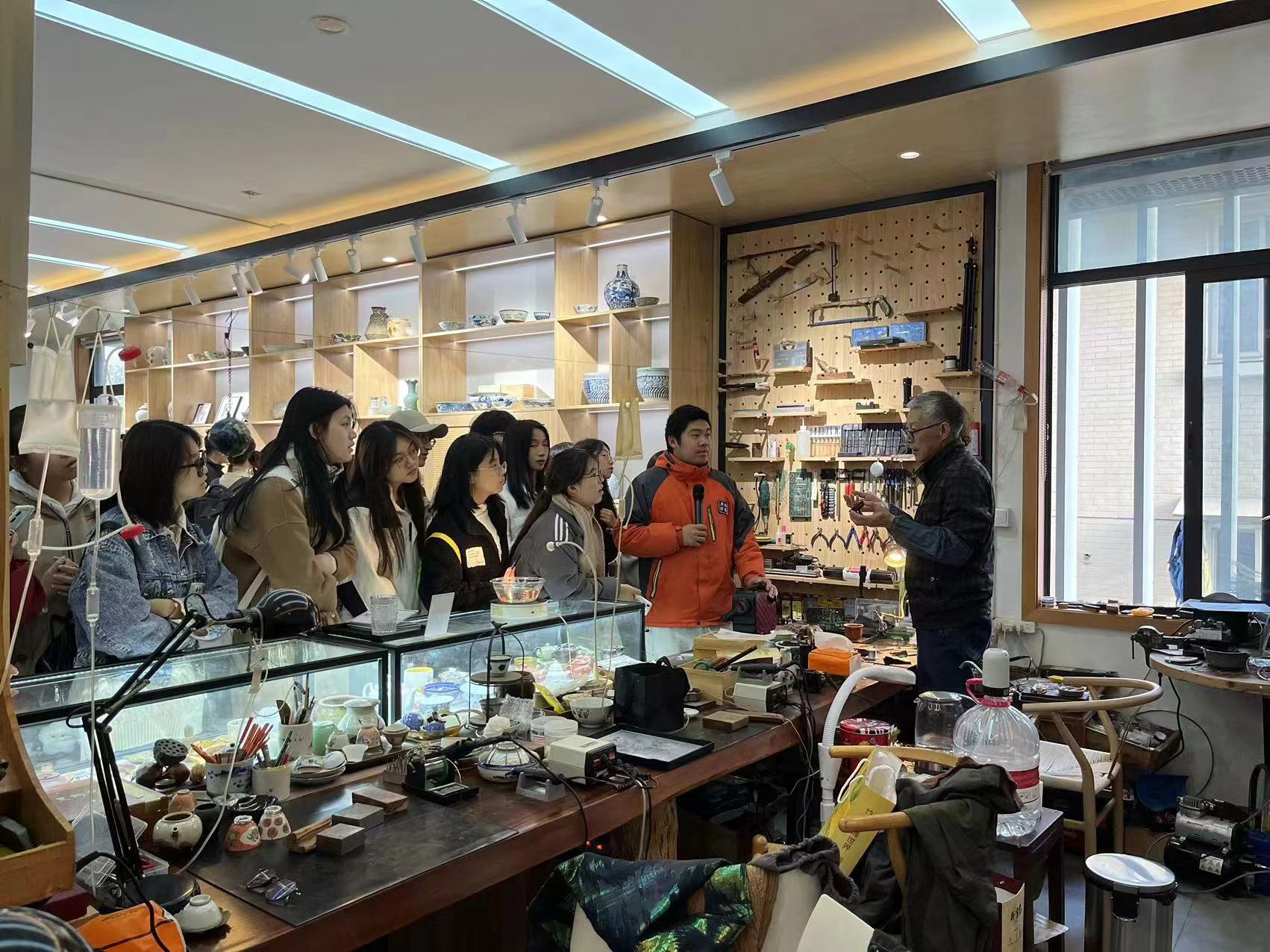 第一站,同学们穿行居民生活区,抵达宽敞明亮的文化活动中心,内设活动室、图书室、运动场、成华区非遗传习基地“王培波陶瓷艺术工作室”等。同学们与非遗传承人热切交谈,体验传统技艺的赓续弘扬,体会社区能人的引领示范,体认老年群体的生活风貌。