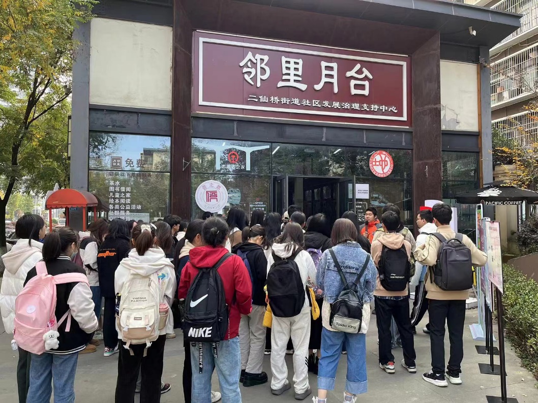 11月27日上午,《社会工作导论》课程实践教学在成都市成华区二仙桥街道下涧槽社区“邻里月台”开展。此次活动由社会学与心理学系袁芮副教授带队,2023级社会工作专业本科生参加。同学们在爱有戏社区发展中心工作人员的带领下,以社区漫步、座谈交流的形式,对社区内极具特色的“邻里月台”建设经验进行了集中学习,深入了解社会工作机构参与基层治理的经验与成果。