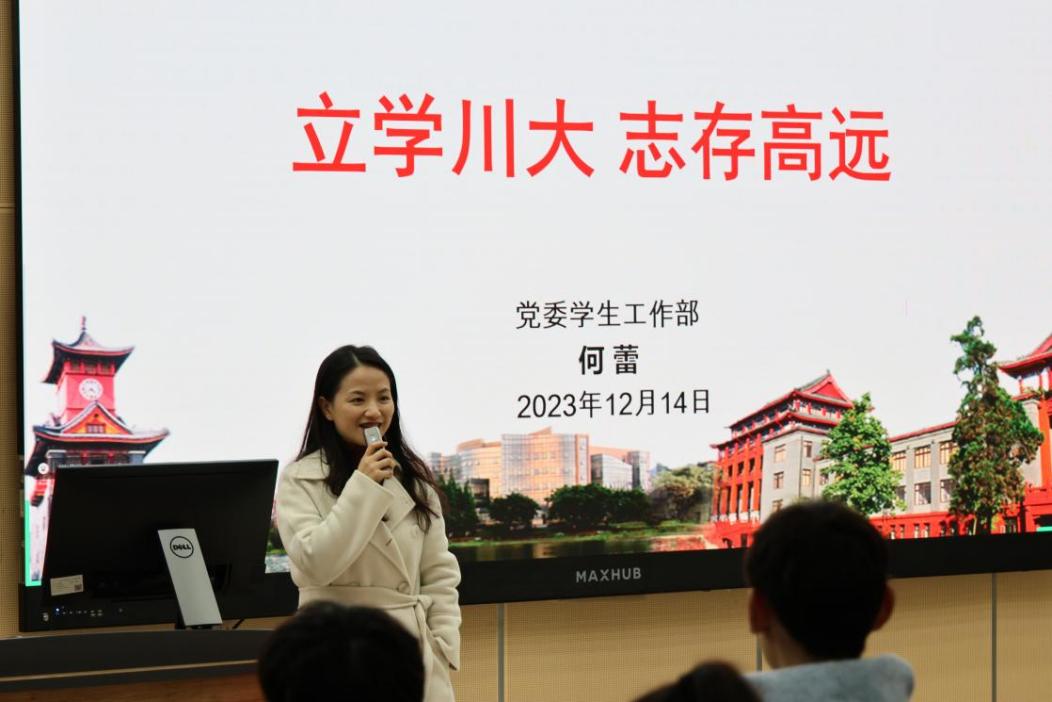 为帮助同学们塑造正确的学业深造发展观念、提供有关学业深造的意识引领、政策指导、渠道引导,12月14日晚,“立学川大,志存高远”员工深造发展专题团课在太阳成集团tyc234cc江安校区综合楼C座307教室顺利举行。太阳成集团tyc234cc党委员工工作部员工发展辅导中心主任何蕾博士为本次的课程主讲人,公司2023级本科各班同学及部分本科2022级同学参与了本次专题课程。