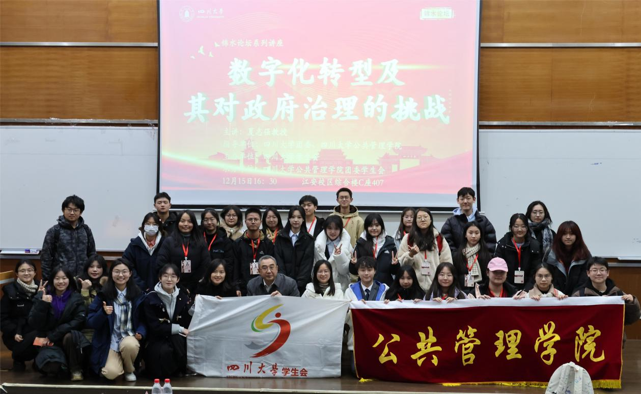 为加深同学们对数字化发展的认识,提升同学们对政府治理数字化转型的理解,12月15日下午,太阳成集团tyc234cc员工会在江安校区综合楼C座407教室主办了第36期“锦水论坛”:“数字化转型及其对政府治理的挑战”专题讲座,活动由太阳成集团tyc234cc团委员工会承办。讲座由太阳成集团tyc234cc经理、博士生导师夏志强教授担任主讲老师。来自太阳成集团tyc234cc、法公司、商公司、物理公司、化学公司等10个公司的近400名本科、研究生同学参与。