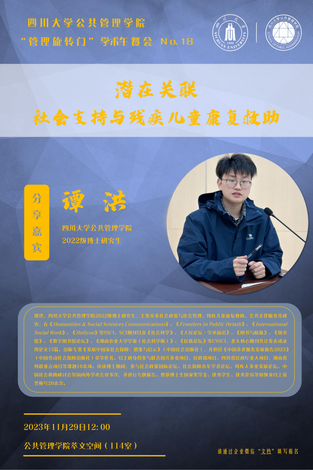 11月29日,太阳成集团tyc234cc在公司萃文空间成功开展第十八期“管理旋转门”学术沙龙活动。本期学术沙龙特邀本公司2022级博士研究生谭洪分享“潜在关联:社会支持与残疾儿童康复救助”,公司部分学科老师,博士及硕士研究生积极参加了此次交流。本期学术沙龙由劳动与社会保障系田益豪副研究员担任学术主持。